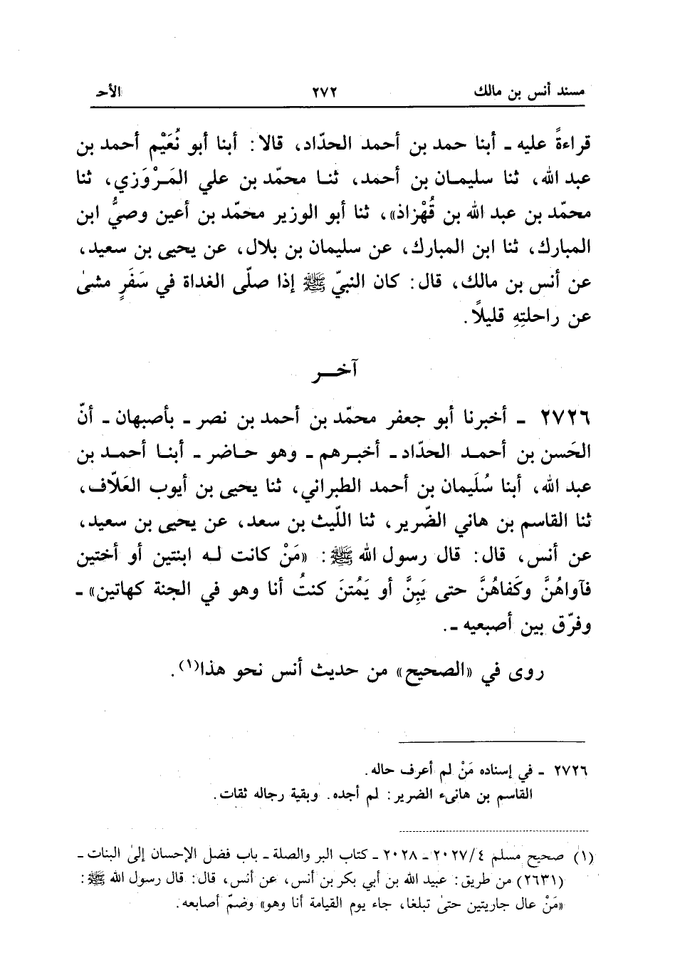 ٢٧٢٦ - أَخْبَرَنَا أَبُو جَعْفَرٍ مُحَمَّدُ بْنُ أَحْمَدَ بْنِ نَصْرٍ - بِأَصْبَهَانَ - أَنَّ الْحَسَنَ بْنَ أَحْمَدَ الْحَدَّادَ أَخْبَرَهُمْ - وَهُوَ حَاضِرٌ - أَبْنَا أَحْمَدُ بْنُ عَبْدِ اللهِ، أَبْنَا سُلَيْمَانُ بْنُ أَحْمَدَ الطَّبَرَانِيُّ، ثَنَا يَحْيَى بْنُ أَيُّوبَ الْعَلَّافُ، ثَنَا الْقَاسِمُ بْنُ هَانِي الضَّرِيرُ، ثَنَا اللَّيْثُ بْنُ سَعْدٍ، عَنْ يَحْيَى بْنِ سَعِيدٍ، عَنْ أَنَسٍ، قَالَ: قَالَ رَسُولُ اللهِ صَلَّى اللهُ عَلَيْهِ وَسَلَّمَ: «مَنْ كَانَتْ لَهُ ابْنَتَانِ أَوْ أُخْتَانِ فَآوَاهُنَّ وَكَفَاهُنَّ حَتَّى يَبِنَّ أَوْ يَمُتْنَ كُنْتُ أَنَا وَهُوَ فِي الْجَنَّةِ كَهَاتَيْنِ، وَفَرَّقَ بَيْنَ أُصْبُعَيْهِ».