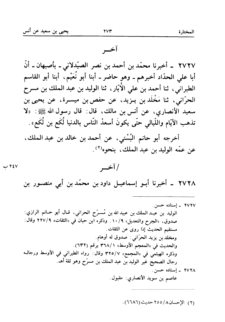 ٢٧٢٧ - أَخْبَرَنَا مُحَمَّدُ بْنُ أَحْمَدَ بْنِ نَصْرٍ الصَّيْدَلَانِيُّ - بِأَصْبَهَانَ - أَنَّ أَبَا عَلِيٍّ الْحَدَّادَ أَخْبَرَهُمْ - وَهُوَ حَاضِرٌ - أَبْنَا أَبُو نُعَيْمٍ، أَبْنَا أَبُو الْقَاسِمِ الطَّبَرَانِيُّ، ثَنَا أَحْمَدُ بْنُ عَلِيٍّ الْأَبَّارُ، ثَنَا الْوَلِيدُ بْنُ عَبْدِ الْمَلِكِ بْنِ مُسَرِّحٍ الْحَرَّانِيُّ، ثَنَا مَخْلَدُ بْنُ يَزِيدَ، عَنْ حَفْصِ بْنِ مَيْسَرَةَ، عَنْ يَحْيَى بْنِ سَعِيدٍ الْأَنْصَارِيِّ، عَنْ أَنَسِ بْنِ مَالِكٍ، قَالَ: قَالَ رَسُولُ اللهِ صَلَّى اللهُ عَلَيْهِ وَسَلَّمَ: «لَا تَذْهَبُ الْأَيَّامُ وَاللَّيَالِي حَتَّى يَكُونَ أَسْعَدَ النَّاسِ بِالدُّنْيَا لُكَعُ بْنُ لُكَعٍ».