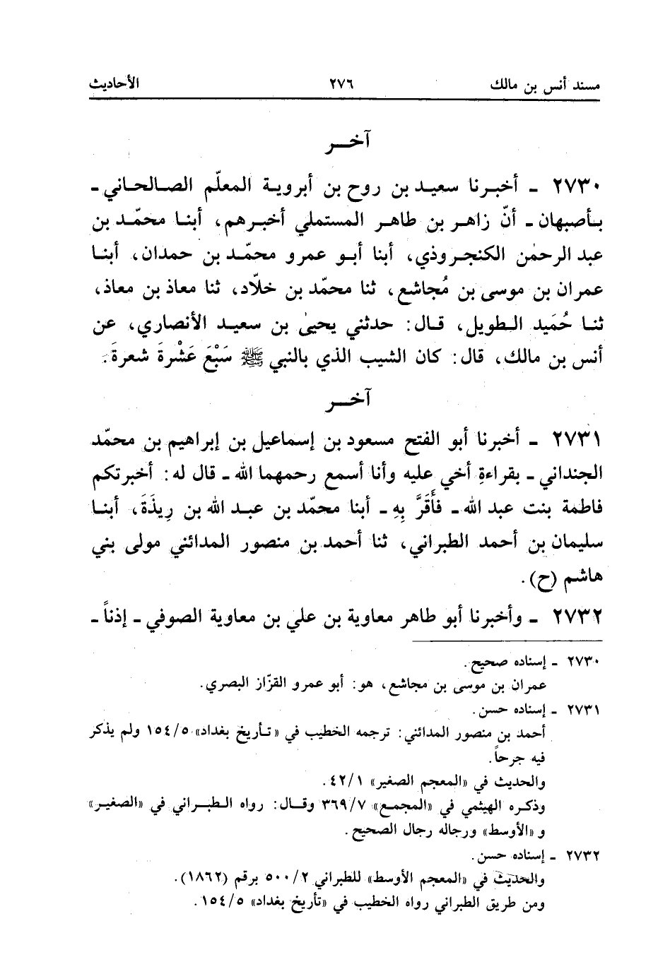 ٢٧٣٠ - أَخْبَرَنَا سَعِيدُ بْنُ رَوْحِ بْنِ أَبْرَوَيْهِ الْمُعَلِّمُ الصَّالْحَانِيُّ - بِأَصْبَهَانَ - أَنَّ زَاهِرَ بْنَ طَاهِرٍ الْمُسْتَمْلِيَّ أَخْبَرَهُمْ، أَبْنَا مُحَمَّدُ بْنُ عَبْدِ الرَّحْمَنِ الْكَنْجَرُوذِيُّ، أَبْنَا أَبُو عَمْرٍو مُحَمَّدُ بْنُ حَمْدَانَ، أَبْنَا عِمْرَانُ بْنُ مُوسَى بْنِ مُجَاشِعٍ، ثَنَا مُحَمَّدُ بْنُ خَلَّادٍ، ثَنَا مُعَاذُ بْنُ مُعَاذٍ، ثَنَا حُمَيْدٌ الطَّوِيلُ قَالَ: حَدَّثَنِي يَحْيَى بْنُ سَعِيدٍ الْأَنْصَارِيُّ، عَنْ أَنَسِ بْنِ مَالِكٍ قَالَ: «كَانَ الشَّيْبُ الَّذِي بِالنَّبِيِّ صَلَّى اللهُ عَلَيْهِ وَسَلَّمَ سَبْعَ عَشْرَةَ شَعَرَةً».