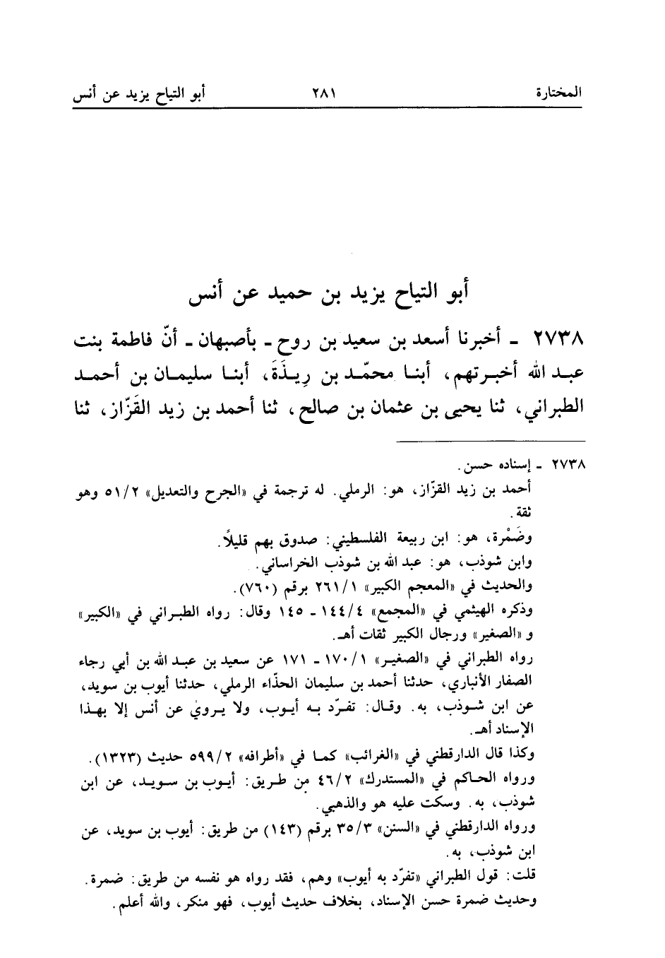 ٢٧٣٧ - أَخْبَرَنَا أَسْعَدُ بْنُ سَعِيدِ بْنِ رَوْحٍ - بِأَصْبَهَانَ - أَنَّ فَاطِمَةَ بِنْتَ عَبْدِ اللهِ أَخْبَرَتْهُمْ، أَبْنَا مُحَمَّدُ بْنُ رِيذَةَ، أَبْنَا سُلَيْمَانُ بْنُ أَحْمَدَ الطَّبَرَانِيُّ، ثَنَا يَحْيَى بْنُ عُثْمَانَ بْنِ صَالِحٍ، ثَنَا أَحْمَدُ بْنُ زَيْدٍ الْقَزَّازُ، ثَنَا