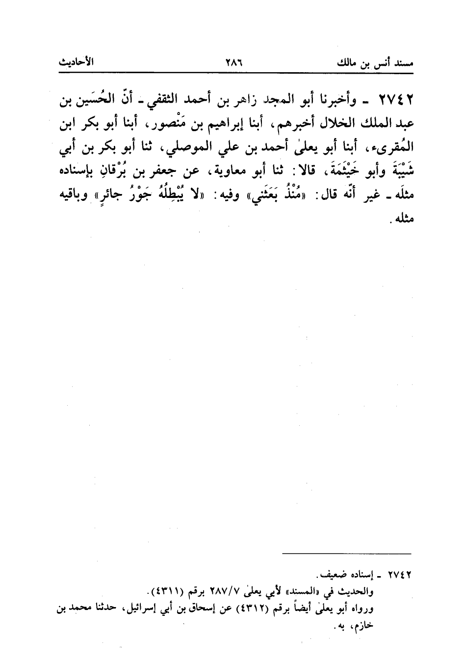 ٢٧٤١ - وَأَخْبَرَنَا أَبُو الْمَجْدِ زَاهِرُ بْنُ أَحْمَدَ الثَّقَفِيُّ، أَنَّ الْحُسَيْنَ بْنَ عَبْدِ الْمَلِكِ الْخَلَّالَ أَخْبَرَهُمْ، أَبْنَا إِبْرَاهِيمُ بْنُ مَنْصُورٍ، أَبْنَا أَبُو بَكْرٍ ابْنُ الْمُقْرِئِ، أَبْنَا أَبُو يَعْلَى أَحْمَدُ بْنُ عَلِيٍّ الْمَوْصِلِيُّ، ثَنَا أَبُو بَكْرِ بْنُ أَبِي شَيْبَةَ وَأَبُو خَيْثَمَةَ قَالَا: ثَنَا أَبُو مُعَاوِيَةَ، عَنْ جَعْفَرِ بْنِ بُرْقَانَ بِإِسْنَادِهِ مِثْلَهُ - غَيْرَ أَنَّهُ قَالَ: مُنْذُ بَعَثَنِي، وَفِيهِ: لَا يُبْطِلُهُ جَوْرُ جَائِرٍ، وَبَاقِيهِ مِثْلُهُ.