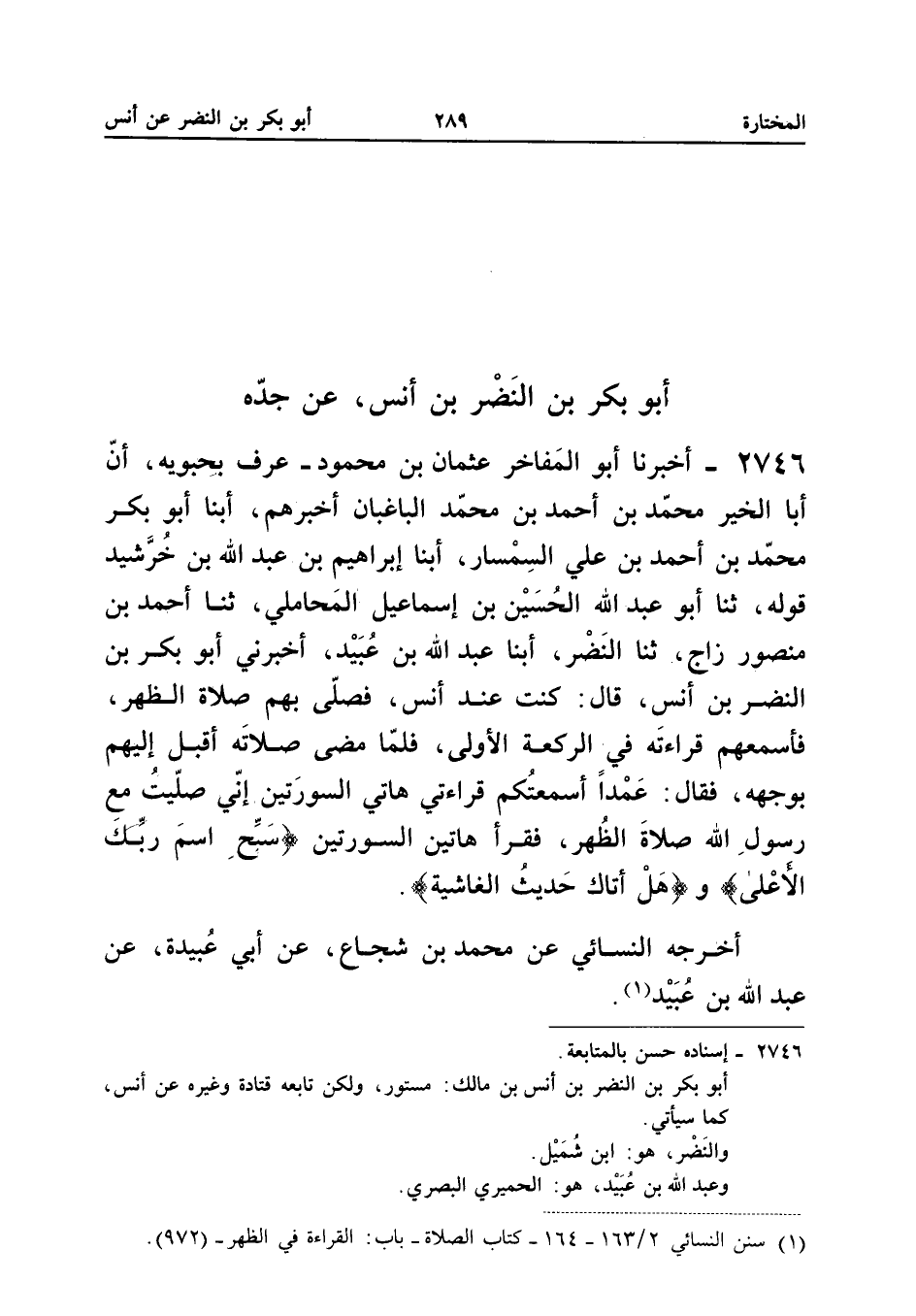 ٢٧٤٥ - أَخْبَرَنَا أَبُو الْمَفَاخِرِ عُثْمَانُ بْنُ مَحْمُودٍ - عُرِفَ بِحَبُّوَيْهِ - أَنَّ أَبَا الْخَيْرِ مُحَمَّدَ بْنَ أَحْمَدَ بْنِ مُحَمَّدٍ الْبَاغْبَانَ أَخْبَرَهُمْ، أَبْنَا أَبُو بَكْرٍ مُحَمَّدُ بْنُ أَحْمَدَ بْنِ عَلِيٍّ السِّمْسَارُ، أَبْنَا إِبْرَاهِيمُ بْنُ عَبْدِ اللهِ بْنِ خُرْشَيْدَ قَوْلَهُ، ثَنَا أَبُو عَبْدِ اللهِ الْحُسَيْنُ بْنُ إِسْمَاعِيلَ الْمَحَامِلِيُّ، ثَنَا أَحْمَدُ بْنُ مَنْصُورٍ زَاجٌ، ثَنَا النَّضْرُ، أَبْنَا عَبْدُ اللهِ بْنُ عُبَيْدٍ، أَخْبَرَنِي أَبُو بَكْرِ بْنُ النَّضْرِ بْنِ أَنَسٍ، قَالَ: «كُنْتُ عِنْدَ أَنَسٍ فَصَلَّى بِهِمْ صَلَاةَ الظُّهْرِ، فَأَسْمَعَهُمْ قِرَاءَتَهُ فِي الرَّكْعَةِ الْأُولَى، فَلَمَّا مَضَى صَلَاتَهُ أَقْبَلَ إِلَيْهِمْ بِوَجْهِهِ، فَقَالَ: عَمْدًا أَسْمَعْتُكُمْ قِرَاءَتِي هَاتَيْنِ السُّورَتَيْنِ، إِنِّي صَلَّيْتُ مَعَ رَسُولِ اللهِ صَلَاةَ الظُّهْرِ فَقَرَأَ هَاتَيْنِ السُّورَتَيْنِ {سَبِّحِ اسْمَ رَبِّكَ الْأَعْلَى} وَ {هَلْ أَتَاكَ حَدِيثُ الْغَاشِيَةِ}».