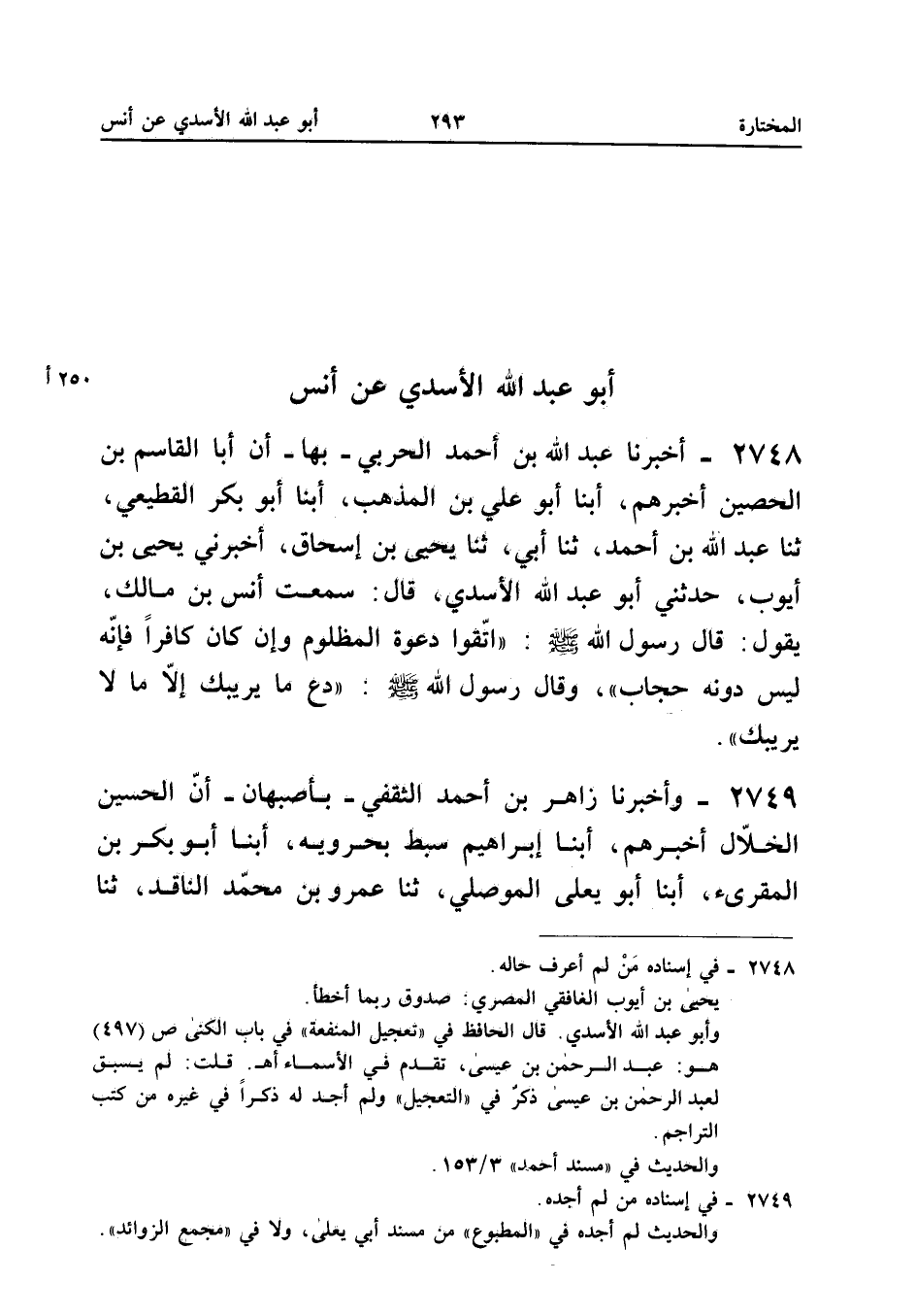 ٢٧٤٧ - أَخْبَرَنَا عَبْدُ اللهِ بْنُ أَحْمَدَ الْحَرْبِيُّ - بِهَا - أَنَّ أَبَا الْقَاسِمِ بْنَ الْحُصَيْنِ أَخْبَرَهُمْ، أَبْنَا أَبُو عَلِيِّ بْنُ الْمُذْهِبِ، أَبْنَا أَبُو بَكْرٍ الْقَطِيعِيُّ، ثَنَا عَبْدُ اللهِ بْنُ أَحْمَدَ، ثَنَا أَبِي، ثَنَا يَحْيَى بْنُ إِسْحَاقَ، أَخْبَرَنِي يَحْيَى بْنُ أَيُّوبَ، حَدَّثَنِي أَبُو عَبْدِ اللهِ الْأَسَدِيُّ، قَالَ: سَمِعْتُ أَنَسَ بْنَ مَالِكٍ يَقُولُ: قَالَ رَسُولُ اللهِ صَلَّى اللهُ عَلَيْهِ وَسَلَّمَ: «اتَّقُوا دَعْوَةَ الْمَظْلُومِ وَإِنْ كَانَ كَافِرًا، فَإِنَّهُ لَيْسَ دُونَهُ حِجَابٌ.»،