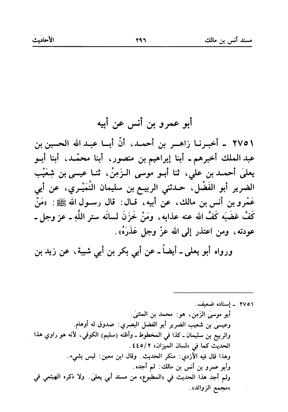 ٢٧٥١ - أَخْبَرَنَا زَاهِرُ بْنُ أَحْمَدَ، أَنَّ أَبَا عَبْدِ اللهِ الْحُسَيْنَ بْنَ عَبْدِ الْمَلِكِ أَخْبَرَهُمْ، أَبْنَا إِبْرَاهِيمُ بْنُ مَنْصُورٍ، أَبْنَا مُحَمَّدٌ، أَبْنَا أَبُو يَعْلَى أَحْمَدُ بْنُ عَلِيٍّ، ثَنَا أَبُو مُوسَى الزَّمِنُ، ثَنَا عِيسَى بْنُ شُعَيْبٍ الضَّرِيرُ أَبُو الْفَضْلِ، حَدَّثَنِي الرَّبِيعُ بْنُ سُلَيْمَانَ النُّمَيْرِيُّ، عَنْ أَبِي عَمْرِو بْنِ أَنَسِ بْنِ مَالِكٍ (¬١)، عَنْ أَبِيهِ، قَالَ: قَالَ رَسُولُ اللهِ صَلَّى اللهُ عَلَيْهِ وَسَلَّمَ: «مَنْ كَفَّ غَضَبَهُ كَفَّ اللهُ عَنْهُ عَذَابَهُ، وَمَنْ خَزَنَ لِسَانَهُ سَتَرَ اللهُ عَزَّ وَجَلَّ عَوْرَتَهُ، وَمَنِ اعْتَذَرَ إِلَى اللهِ عَزَّ وَجَلَّ عَذَرَهُ».