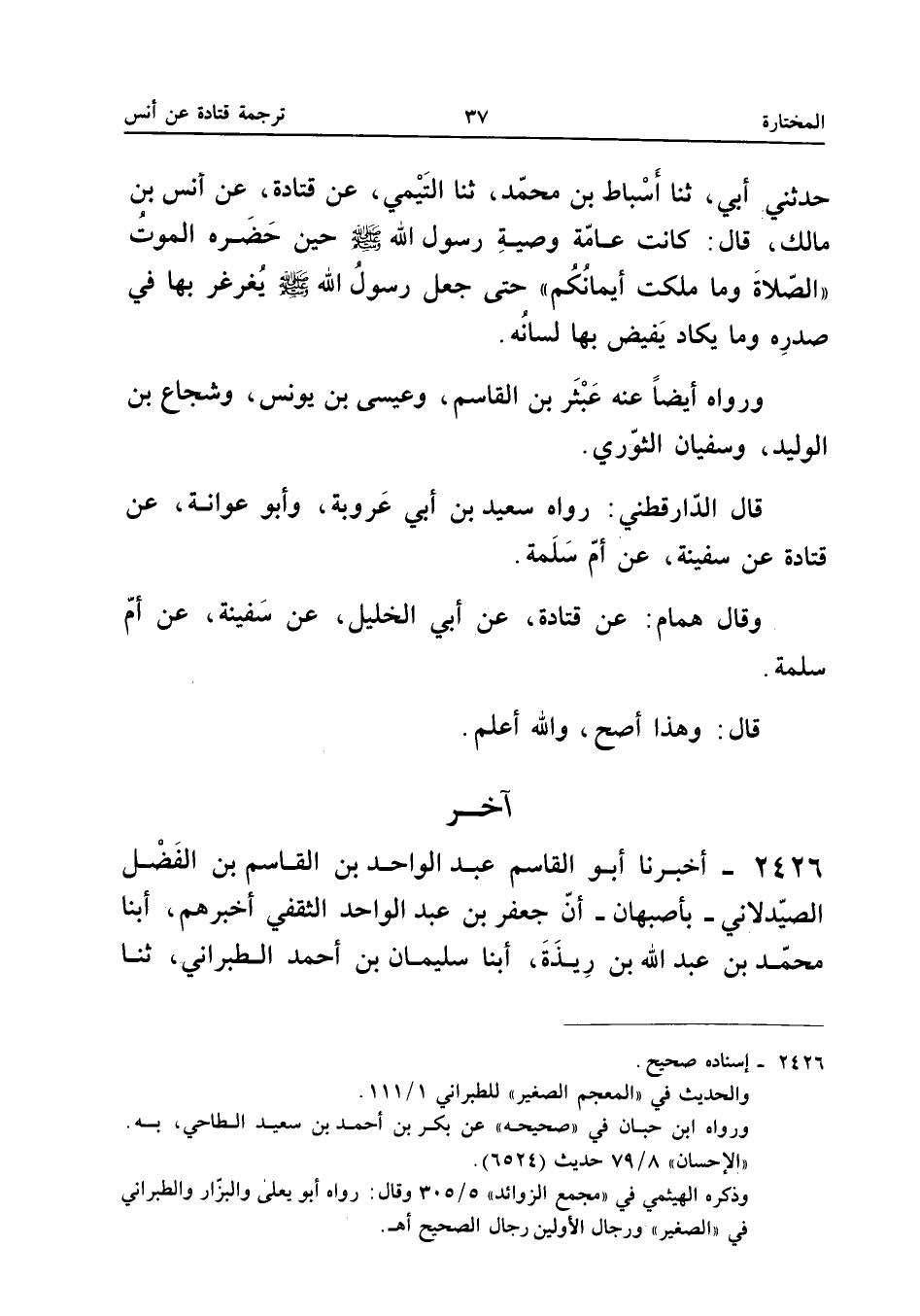 بَكْرُ بْنُ أَحْمَدَ بْنِ سَعْدَوَيْهِ الطَّاحِيُّ الْمُقْرِئُ الْبَصْرِيُّ، ثَنَا نَصْرُ بْنُ عَلِيٍّ، ثَنَا نُوحُ بْنُ قَيْسٍ، عَنْ أَخِيهِ خَالِدِ بْنِ قَيْسٍ، عَنْ قَتَادَةَ، عَنْ أَنَسِ بْنِ مَالِكٍ «أَنَّ رَسُولَ اللهِ صَلَّى اللهُ عَلَيْهِ وَسَلَّمَ كَتَبَ إِلَى بَكْرِ بْنِ وَائِلٍ: مِنْ مُحَمَّدٍ رَسُولِ اللهِ إِلَى بَكْرِ بْنِ وَائِلٍ، أَسْلِمُوا تَسْلَمُوا فَمَا قَرَأَهُ إِلَّا رَجُلٌ مِنْ بَنِي ضُبَيْعَةَ، فَهُمْ يُسَمَّوْنَ بَنِي الْكَاتِبِ».