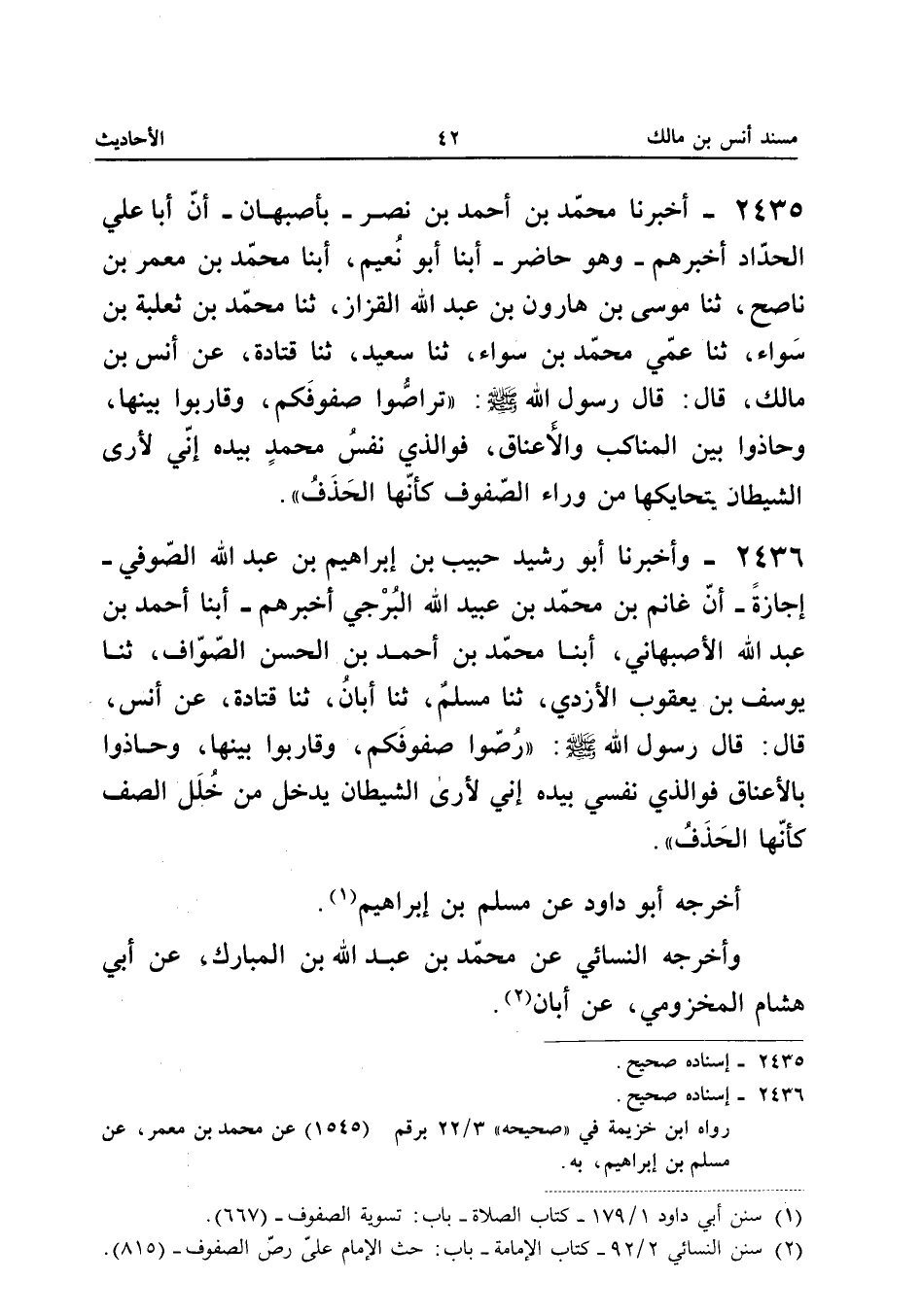 ٢٤٣٦ - وَأَخْبَرَنَا أَبُو رَشِيدٍ حَبِيبُ بْنُ إِبْرَاهِيمَ بْنِ عَبْدِ اللهِ الصُّوفِيُّ - إِجَازَةً - أَنَّ غَانِمَ بْنَ مُحَمَّدِ بْنِ عُبَيْدِ اللهِ الْبُرْجِيَّ أَخْبَرَهُمْ، أَبْنَا أَحْمَدُ بْنُ عَبْدِ اللهِ الْأَصْبَهَانِيُّ، أَبْنَا مُحَمَّدُ بْنُ أَحْمَدَ بْنِ الْحَسَنِ الصَّوَّافُ، ثَنَا يُوسُفُ بْنُ يَعْقُوبَ الْأَزْدِيُّ، ثَنَا مُسْلِمٌ، ثَنَا أَبَانُ، ثَنَا قَتَادَةُ، عَنْ أَنَسٍ، قَالَ: قَالَ رَسُولُ اللهِ صَلَّى اللهُ عَلَيْهِ وَسَلَّمَ «رُصُّوا صُفُوفَكُمْ، وَقَارِبُوا بَيْنَهَا، وَحَاذُوا بِالْأَعْنَاقِ، فَوَالَّذِي نَفْسِي بِيَدِهِ إِنِّي لَأَرَى الشَّيْطَانَ يَدْخُلُ مِنْ خَلَلِ الصَّفِّ كَأَنَّهَا الْحَذَفُ»