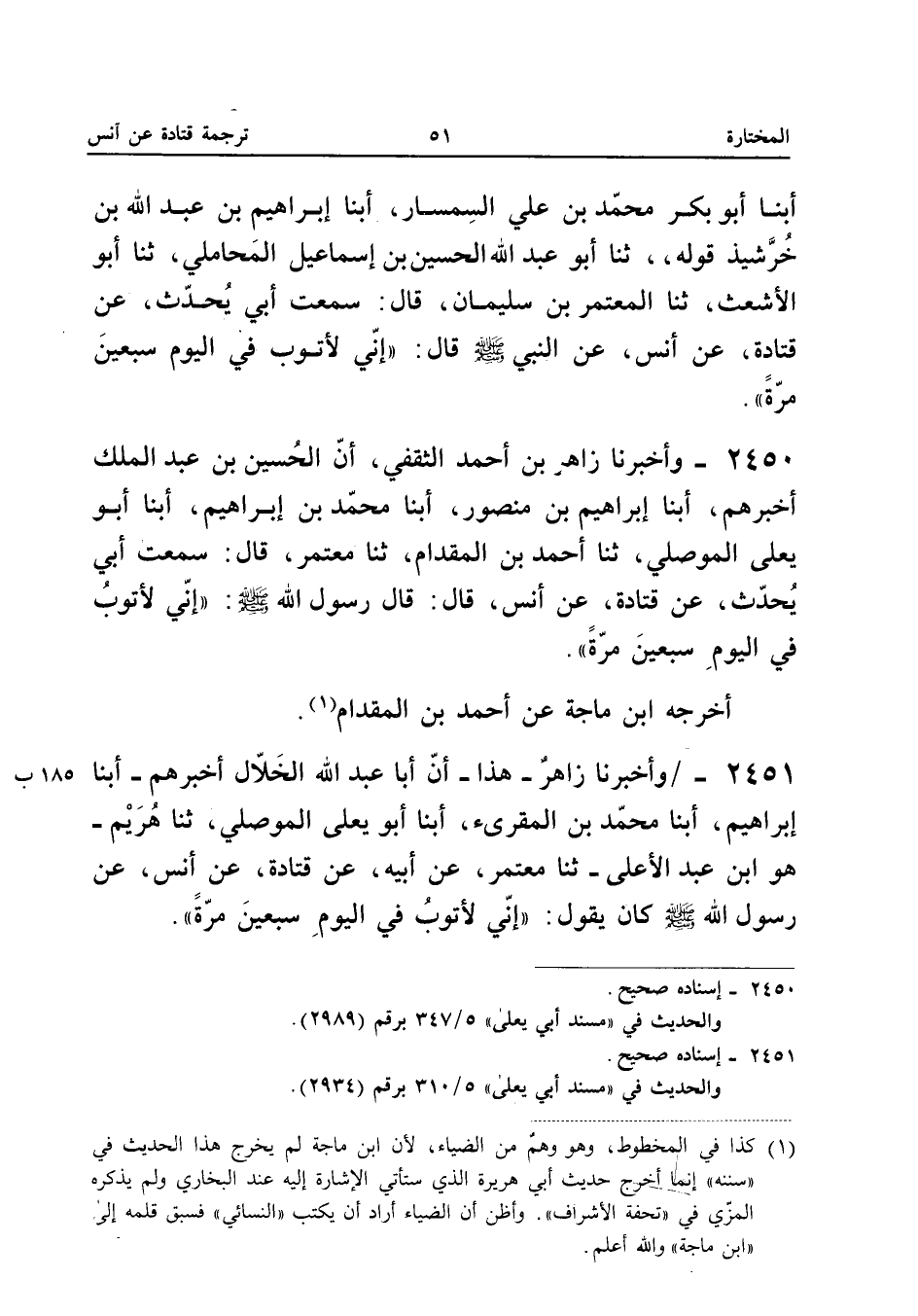 ٢٤٥١ - وَأَخْبَرَنَا زَاهِرٌ هَذَا أَنَّ أَبَا عَبْدِ اللهِ الْخَلَّالَ أَخْبَرَهُمْ، أَبْنَا إِبْرَاهِيمُ، أَبْنَا مُحَمَّدُ بْنُ الْمُقْرِئِ، أَبْنَا أَبُو يَعْلَى الْمَوْصِلِيُّ، ثَنَا هُرَيْمٌ هُوَ ابْنُ عَبْدِ الْأَعْلَى، ثَنَا مُعْتَمِرٌ، عَنْ أَبِيهِ، عَنْ قَتَادَةَ، عَنْ أَنَسٍ، عَنْ رَسُولِ اللهِ صَلَّى اللهُ عَلَيْهِ وَسَلَّمَ كَانَ يَقُولُ «إِنِّي لَأَتُوبُ فِي الْيَوْمِ سَبْعِينَ مَرَّةً».