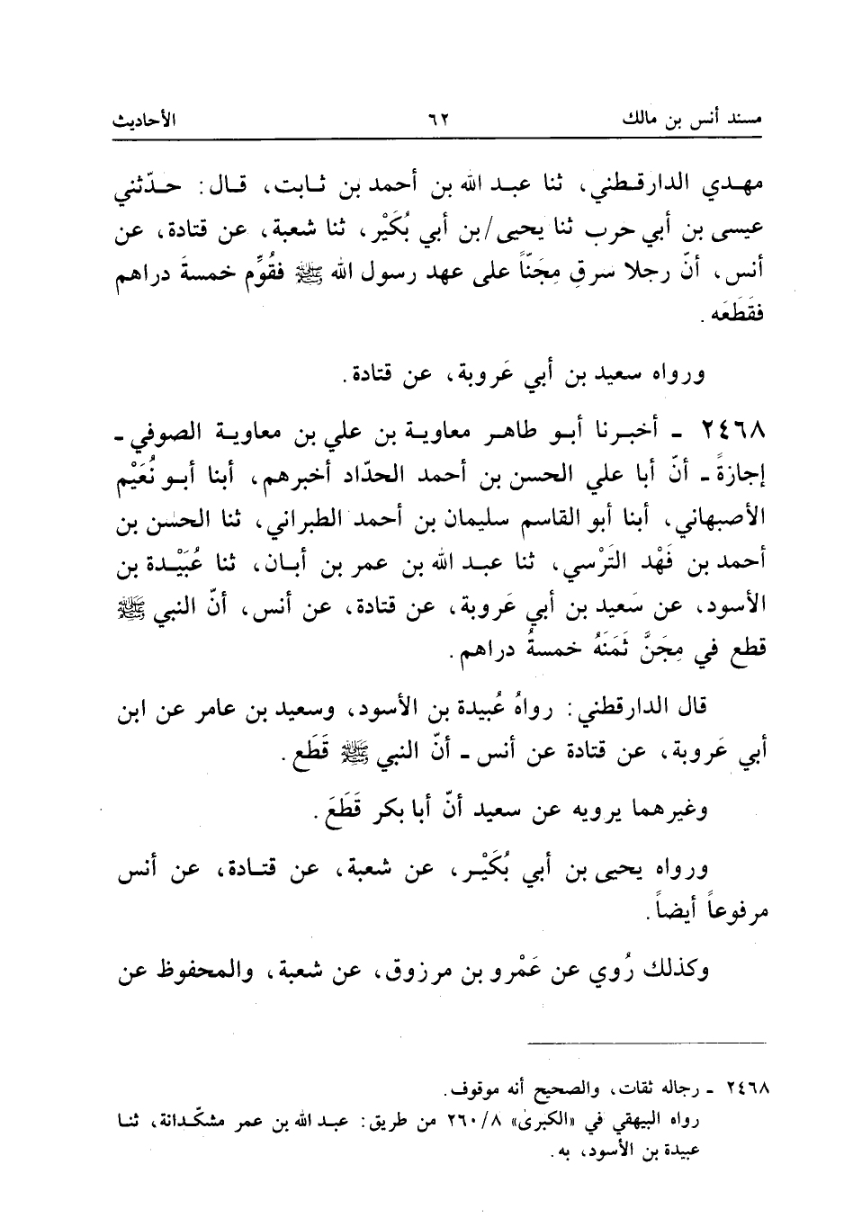 قَالَ الدَّارَقُطْنِيُّ: رَوَاهُ عُبَيْدَةُ بْنُ الْأَسْوَدِ وَسَعِيدُ بْنُ عَامِرٍ، عَنِ ابْنِ أَبِي عَرُوبَةَ، عَنْ قَتَادَةَ، عَنْ أَنَسٍ: أَنَّ النَّبِيَّ صَلَّى اللهُ عَلَيْهِ وَسَلَّمَ قَطَعَ.
