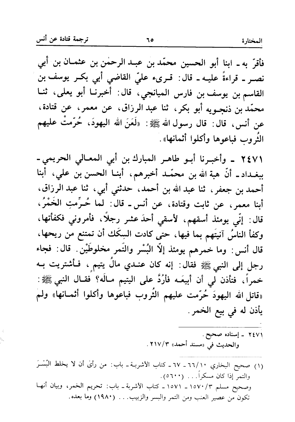 ٢٤٧١ - وَأَخْبَرَنَا أَبُو طَاهِرٍ الْمُبَارَكُ بْنُ أَبِي الْمَعَالِي الْحَرِيمِيُّ - بِبَغْدَادَ - أَنَّ هِبَةَ اللهِ بْنَ مُحَمَّدٍ أَخْبَرَهُمْ، أَبْنَا الْحَسَنُ بْنُ عَلِيٍّ، أَبْنَا أَحْمَدُ بْنُ جَعْفَرٍ، ثَنَا عَبْدُ اللهِ بْنُ أَحْمَدَ، حَدَّثَنِي أَبِي، ثَنَا عَبْدُ الرَّزَّاقِ، أَبْنَا مَعْمَرٌ، عَنْ ثَابِتٍ وَقَتَادَةَ، عَنْ أَنَسٍ قَالَ - «لَمَّا حُرِّمَتِ الْخَمْرُ قَالَ: إِنِّي يَوْمَئِذٍ أَسْقِيهِمْ، لَأَسْقِي أَحَدَ عَشَرَ رَجُلًا، فَأَمَرُونِي فَكَفَأْتُهَا، وَكَفَأَ النَّاسُ آنِيَتَهُمْ بِمَا فِيهَا حَتَّى كَادَتِ السِّكَكُ أَنْ تُمْتَنَعَ مِنْ رِيحِهَا، قَالَ أَنَسٌ: وَمَا خَمْرُهُمْ يَوْمَئِذٍ إِلَّا الْبُسْرُ وَالتَّمْرُ مَخْلُوطَيْنِ، قَالَ: فَجَاءَ رَجُلٌ إِلَى النَّبِيِّ صَلَّى اللهُ عَلَيْهِ وَسَلَّمَ فَقَالَ: إِنَّهُ كَانَ عِنْدِي مَالُ يَتِيمٍ فَاشْتَرَيْتُ بِهِ خَمْرًا فَتَأْذَنُ لِي أَنْ أَبِيعَهُ فَأَرُدَّ عَلَى الْيَتِيمِ مَالَهُ؟ فَقَالَ النَّبِيُّ صَلَّى اللهُ عَلَيْهِ وَسَلَّمَ: قَاتَلَ اللهُ الْيَهُودَ، حُرِّمَتْ عَلَيْهِ الثُّرُوبُ فَبَاعُوهَا وَأَكَلُوا أَثْمَانَهَا، وَلَمْ يَأْذَنْ لَهُ فِي بَيْعِ الْخَمْرِ».