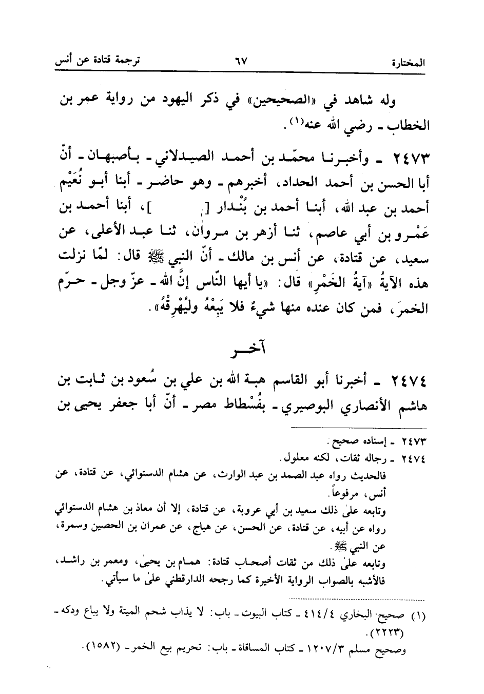 ٢٤٧٣ - وَأَخْبَرَنَا مُحَمَّدُ بْنُ أَحْمَدَ الصَّيْدَلَانِيُّ - بِأَصْبَهَانَ - أَنَّ أَبَا الْحَسَنِ بْنَ أَحْمَدَ الْحَدَّادَ (¬١) أَخْبَرَهُمْ - وَهُوَ حَاضِرٌ - أَبْنَا أَبُو نُعَيْمٍ أَحْمَدُ بْنُ عَبْدِ اللهِ، أَبْنَا أَحْمَدُ بْنُ بُنْدَارٍ [ ... ]، أَبْنَا أَحْمَدُ بْنُ عَمْرِو بْنِ أَبِي عَاصِمٍ، ثَنَا أَزْهَرُ بْنُ مَرْوَانَ، ثَنَا عَبْدُ الْأَعْلَى، عَنْ سَعِيدٍ، عَنْ قَتَادَةَ، عَنْ أَنَسِ بْنِ مَالِكٍ، «أَنَّ النَّبِيَّ صَلَّى اللهُ عَلَيْهِ وَسَلَّمَ قَالَ لَمَّا نَزَلَتْ هَذِهِ الْآيَةُ آيَةُ الْخَمْرِ قَالَ: يَا أَيُّهَا النَّاسُ، إِنَّ اللهَ - عَزَّ وَجَلَّ - حَرَّمَ الْخَمْرَ، فَمَنْ كَانَ عِنْدَهُ مِنْهَا شَيْءٌ فَلَا يَبِعْهُ وَلْيُهْرِقْهُ».