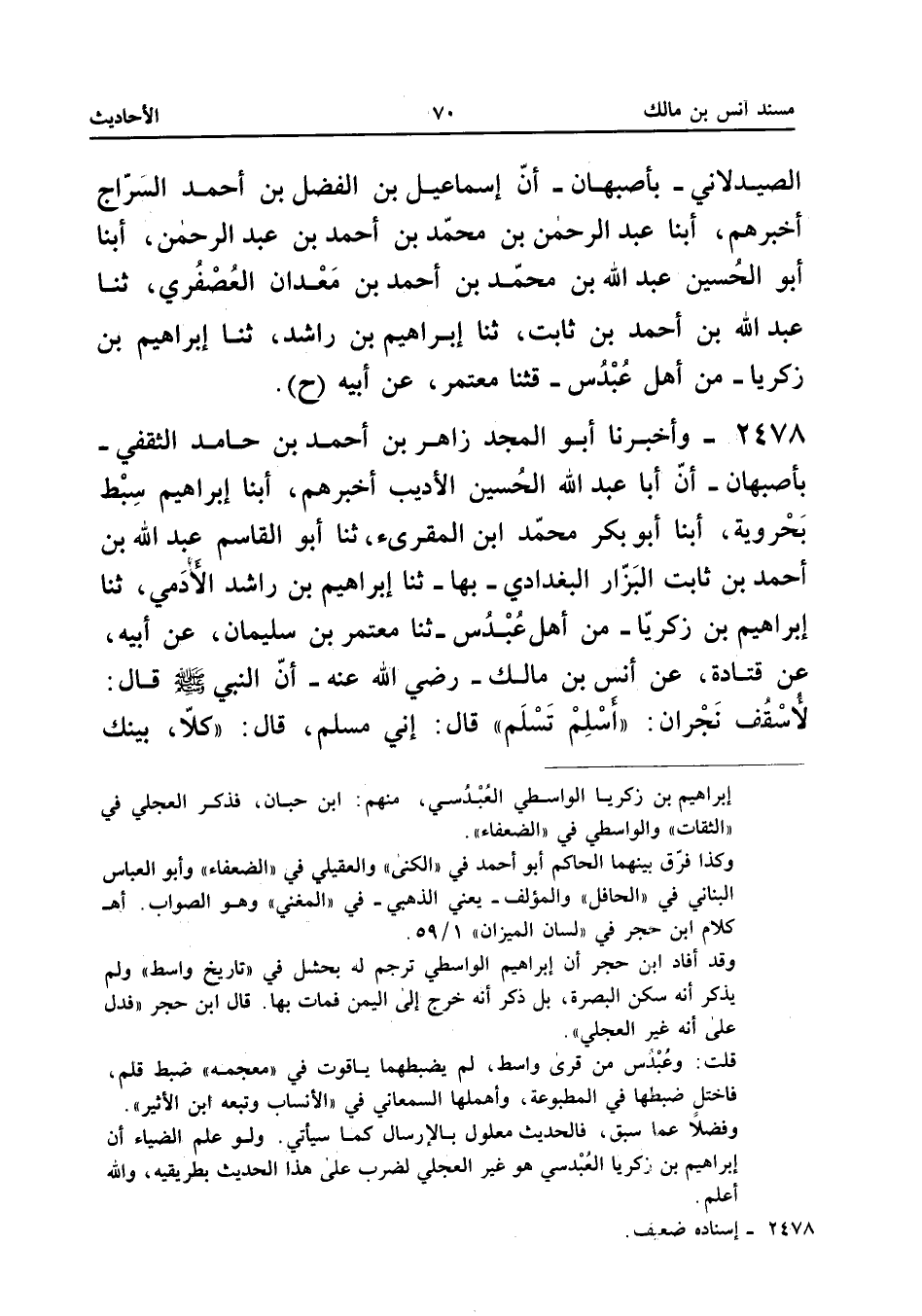 ٢٤٧٨ - وَأَخْبَرَنَا أَبُو الْمَجْدِ زَاهِرُ بْنُ أَحْمَدَ بْنِ حَامِدٍ الثَّقَفِيُّ - بِأَصْبَهَانَ - أَنَّ أَبَا عَبْدِ اللهِ الْحُسَيْنَ الْأَدِيبَ أَخْبَرَهُمْ، أَبْنَا إِبْرَاهِيمُ سِبْطُ بَحْرَوَيْهِ، أَبْنَا أَبُو بَكْرٍ مُحَمَّدُ بْنُ الْمُقْرِئِ، ثَنَا أَبُو الْقَاسِمِ عَبْدُ اللهِ بْنُ أَحْمَدَ بْنِ ثَابِتٍ الْبَزَّارُ الْبَغْدَادِيُّ - بِهَا - ثَنَا إِبْرَاهِيمُ بْنُ رَاشِدٍ الْأَدَمِيُّ، ثَنَا إِبْرَاهِيمُ بْنُ زَكَرِيَّا - مِنْ أَهْلِ عُبْدُسَ - ثَنَا مُعْتَمِرُ بْنُ سُلَيْمَانَ، عَنْ أَبِيهِ، عَنْ قَتَادَةَ، عَنْ أَنَسِ بْنِ مَالِكٍ - رَضِيَ اللهُ عَنْهُ - «أَنَّ النَّبِيَّ صَلَّى اللهُ عَلَيْهِ وَسَلَّمَ قَالَ لِأُسْقُفِّ نَجْرَانَ: أَسْلِمْ تَسْلَمْ، قَالَ: إِنِّي مُسْلِمٌ، قَالَ: كَلَّا، بَيْنَكَ