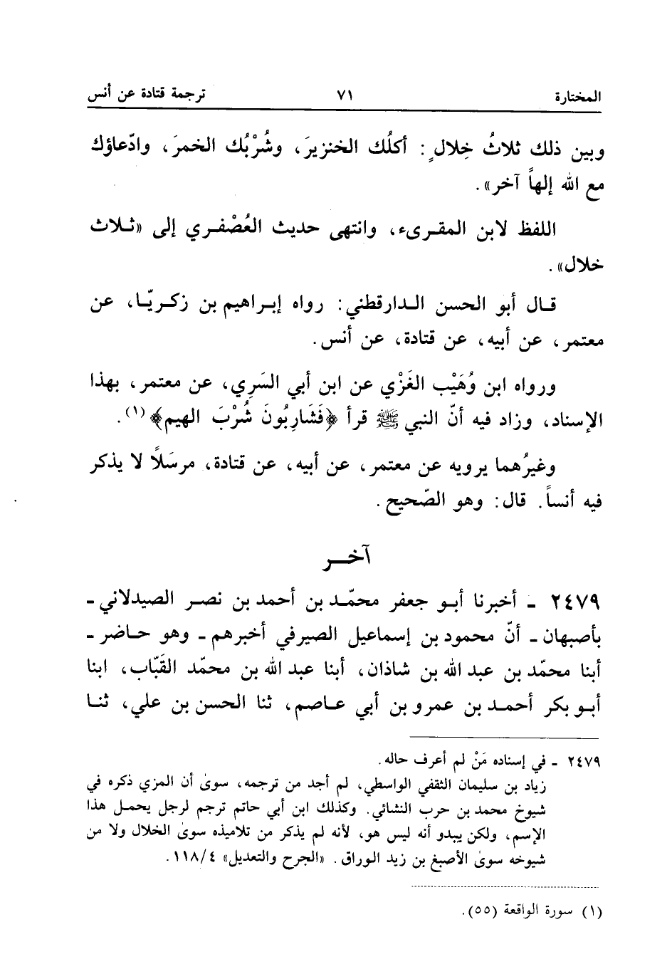 ٢٤٧٩ - أَخْبَرَنَا أَبُو جَعْفَرٍ مُحَمَّدُ بْنُ أَحْمَدَ بْنِ نَصْرٍ الصَّيْدَلَانِيُّ - بِأَصْبَهَانَ - أَنَّ مَحْمُودَ بْنَ إِسْمَاعِيلَ الصَّيْرَفِيَّ أَخْبَرَهُمْ - وَهُوَ حَاضِرٌ - أَبْنَا مُحَمَّدُ بْنُ عَبْدِ اللهِ بْنِ شَاذَانَ، أَبْنَا عَبْدُ اللهِ بْنُ مُحَمَّدٍ الْقَبَّابُ، أَبْنَا أَبُو بَكْرٍ أَحْمَدُ بْنُ عَمْرِو بْنِ أَبِي عَاصِمٍ، ثَنَا الْحَسَنُ بْنُ عَلِيٍّ، ثَنَا