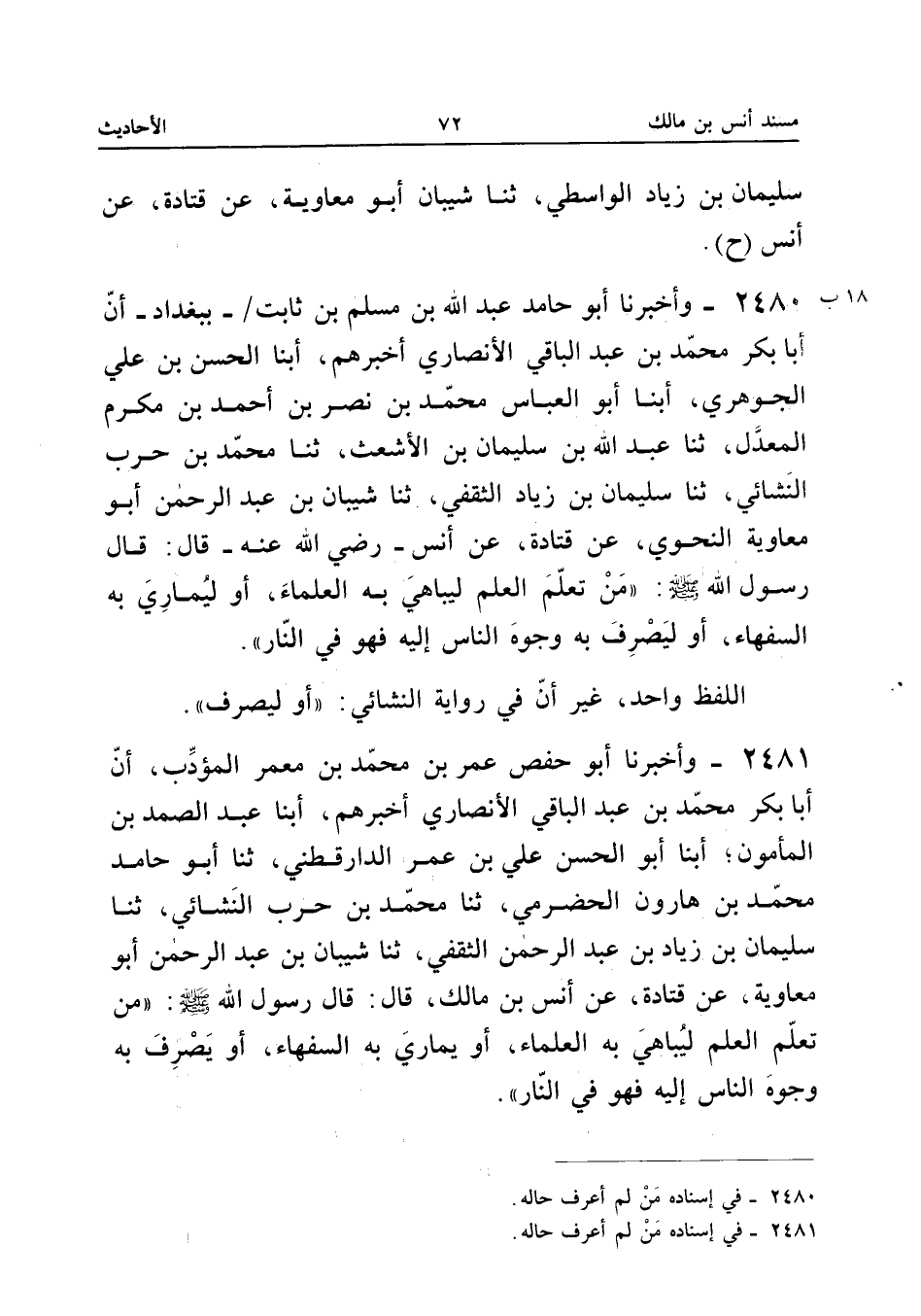 ٢٤٨٠ - وَأَخْبَرَنَا أَبُو حَامِدٍ عَبْدُ اللهِ بْنُ مُسْلِمِ بْنِ ثَابِتٍ - بِبَغْدَادَ - أَنَّ أَبَا بَكْرٍ مُحَمَّدَ بْنَ عَبْدِ الْبَاقِي الْأَنْصَارِيَّ أَخْبَرَهُمْ، أَبْنَا الْحَسَنُ بْنُ عَلِيٍّ الْجَوْهَرِيُّ، أَبْنَا أَبُو الْعَبَّاسِ مُحَمَّدُ بْنُ نَصْرِ بْنِ أَحْمَدَ بْنِ مُكْرَمٍ الْمُعَدَّلُ، ثَنَا عَبْدُ اللهِ بْنُ سُلَيْمَانَ بْنِ الْأَشْعَثِ، ثَنَا مُحَمَّدُ بْنُ حَرْبٍ النَّشَائِيُّ، ثَنَا سُلَيْمَانُ بْنُ زِيَادٍ الثَّقَفِيُّ، ثَنَا شَيْبَانُ بْنُ عَبْدِ الرَّحْمَنِ أَبُو مُعَاوِيَةَ النَّحْوِيُّ، عَنْ قَتَادَةَ، عَنْ أَنَسٍ - رَضِيَ اللهُ عَنْهُ -، قَالَ: قَالَ رَسُولُ اللهِ صَلَّى اللهُ عَلَيْهِ وَسَلَّمَ: «مَنْ تَعَلَّمَ الْعِلْمَ لِيُبَاهِيَ بِهِ الْعُلَمَاءَ، أَوْ لِيُمَارِيَ بِهِ السُّفَهَاءَ، أَوْ لِيَصْرِفَ بِهِ وُجُوهَ النَّاسِ إِلَيْهِ، فَهُوَ فِي النَّارِ».