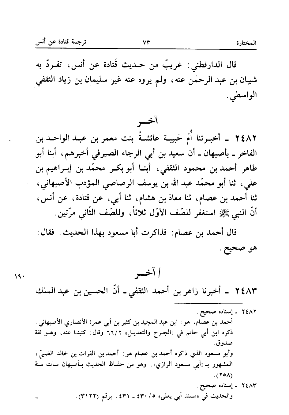 ٢٤٨٢ - أَخْبَرَتْنَا أُمُّ حَبِيبَةَ عَائِشَةُ بِنْتُ مَعْمَرِ بْنِ عَبْدِ الْوَاحِدِ بْنِ الْفَاخِرِ - بِأَصْبَهَانَ - أَنَّ سَعِيدَ بْنَ أَبِي الرَّجَاءِ الصَّيْرَفِيَّ أَخْبَرَهُمْ، أَبْنَا أَبُو طَاهِرٍ أَحْمَدُ بْنُ مَحْمُودٍ الثَّقَفِيُّ، أَبْنَا أَبُو بَكْرٍ مُحَمَّدُ بْنُ إِبْرَاهِيمَ بْنِ عَلِيٍّ، ثَنَا أَبُو مُحَمَّدٍ عَبْدُ اللهِ بْنُ يُوسُفَ الرَّصَاصِيُّ الْمُؤَدِّبُ الْأَصْبَهَانِيُّ، ثَنَا أَحْمَدُ بْنُ عِصَامٍ، ثَنَا مُعَاذُ بْنُ هِشَامٍ، ثَنَا أَبِي، عَنْ قَتَادَةَ، عَنْ أَنَسٍ: «أَنَّ النَّبِيَّ صَلَّى اللهُ عَلَيْهِ وَسَلَّمَ اسْتَغْفَرَ لِلصَّفِّ الْأَوَّلِ ثَلَاثًا، وَلِلصَّفِّ الثَّانِي مَرَّتَيْنِ».