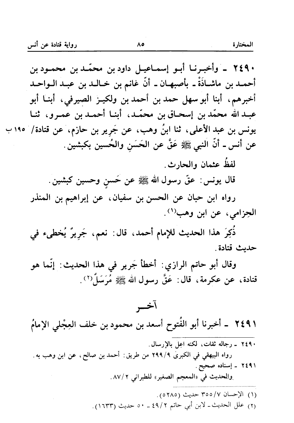 ٢٤٩٠ - وَأَخْبَرَنَا أَبُو إِسْمَاعِيلَ دَاوُدُ بْنُ مُحَمَّدِ بْنِ مَحْمُودِ بْنِ أَحْمَدَ بْنِ مَاشَاذَهْ - بِأَصْبَهَانَ - أَنَّ غَانِمَ بْنَ خَالِدِ بْنِ عَبْدِ الْوَاحِدِ أَخْبَرَهُمْ، أَبْنَا أَبُو سَهْلٍ حَمَدُ بْنُ أَحْمَدَ بْنِ وَلْكِيزَ الصَّيْرَفِيُّ، أَبْنَا أَبُو عَبْدِ اللهِ مُحَمَّدُ بْنُ إِسْحَاقَ بْنِ مُحَمَّدٍ، أَبْنَا أَحْمَدُ بْنُ عَمْرٍو، ثَنَا يُونُسُ بْنُ عَبْدِ الْأَعْلَى، ثَنَا ابْنُ وَهْبٍ، عَنْ جَرِيرِ بْنِ حَازِمٍ، عَنْ قَتَادَةَ، عَنْ أَنَسٍ: «أَنَّ النَّبِيَّ صَلَّى اللهُ عَلَيْهِ وَسَلَّمَ عَقَّ عَنِ الْحَسَنِ وَالْحُسَيْنِ بِكَبْشَيْنِ.