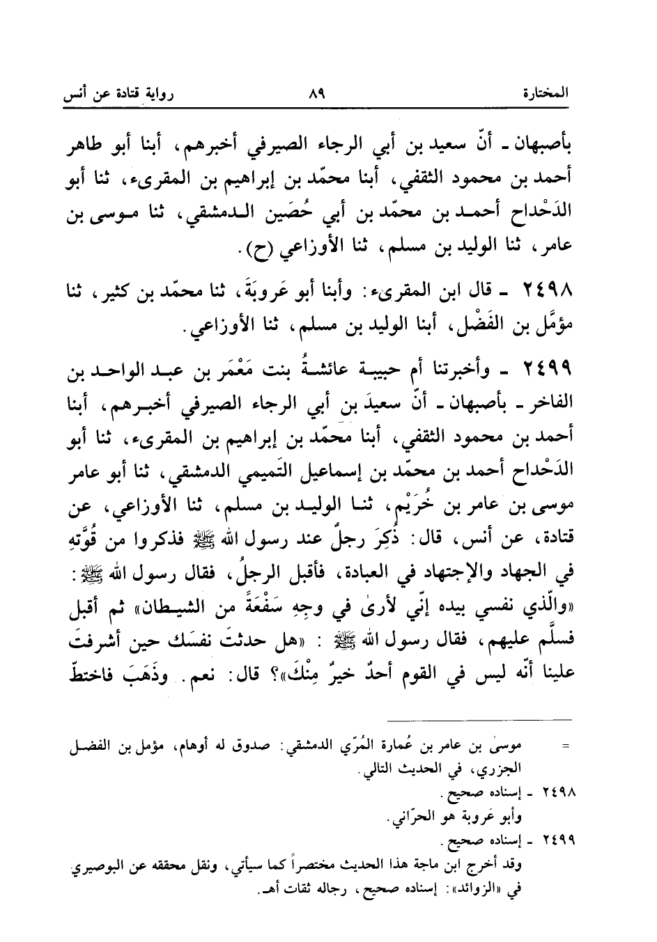 ٢٤٩٩ - وَأَخْبَرَتْنَا أُمُّ حَبِيبَةَ عَائِشَةُ بِنْتُ مَعْمَرِ بْنِ عَبْدِ الْوَاحِدِ بْنِ الْفَاخِرِ - بِأَصْبَهَانَ - أَنَّ سَعِيدَ بْنَ أَبِي الرَّجَاءِ الصَّيْرَفِيَّ أَخْبَرَهُمْ، أَبْنَا أَحْمَدُ بْنُ مَحْمُودٍ الثَّقَفِيُّ، أَبْنَا مُحَمَّدُ بْنُ إِبْرَاهِيمَ بْنِ الْمُقْرِئِ، ثَنَا أَبُو الدَّحْدَاحِ أَحْمَدُ بْنُ مُحَمَّدِ بْنِ إِسْمَاعِيلَ التَّمِيمِيُّ الدِّمَشْقِيُّ، ثَنَا أَبُو عَامِرٍ مُوسَى بْنُ عَامِرِ بْنِ خُرَيْمٍ، ثَنَا الْوَلِيدُ بْنُ مُسْلِمٍ، ثَنَا الْأَوْزَاعِيُّ، عَنْ قَتَادَةَ، عَنْ أَنَسٍ قَالَ: «ذُكِرَ رَجُلٌ عِنْدَ رَسُولِ اللهِ صَلَّى اللهُ عَلَيْهِ وَسَلَّمَ، فَذَكَرُوا مِنْ قُوَّتِهِ فِي الْجِهَادِ وَالِاجْتِهَادِ فِي الْعِبَادَةِ، فَأَقْبَلَ الرَّجُلُ، فَقَالَ رَسُولُ اللهِ صَلَّى اللهُ عَلَيْهِ وَسَلَّمَ: وَالَّذِي نَفْسِي بِيَدِهِ إِنِّي لَأَرَى فِي وَجْهِهِ سَفْعَةً مِنَ الشَّيْطَانِ، ثُمَّ أَقْبَلَ فَسَلَّمَ عَلَيْهِمْ، فَقَالَ رَسُولُ اللهِ صَلَّى اللهُ عَلَيْهِ وَسَلَّمَ: هَلْ حَدَّثْتَ نَفْسَكَ حِينَ أَشْرَفْتَ عَلَيْنَا أَنَّهُ لَيْسَ فِي الْقَوْمِ أَحَدٌ خَيْرًا مِنْكَ؟ قَالَ: نَعَمْ. وَذَهَبَ فَاخْتَطَّ