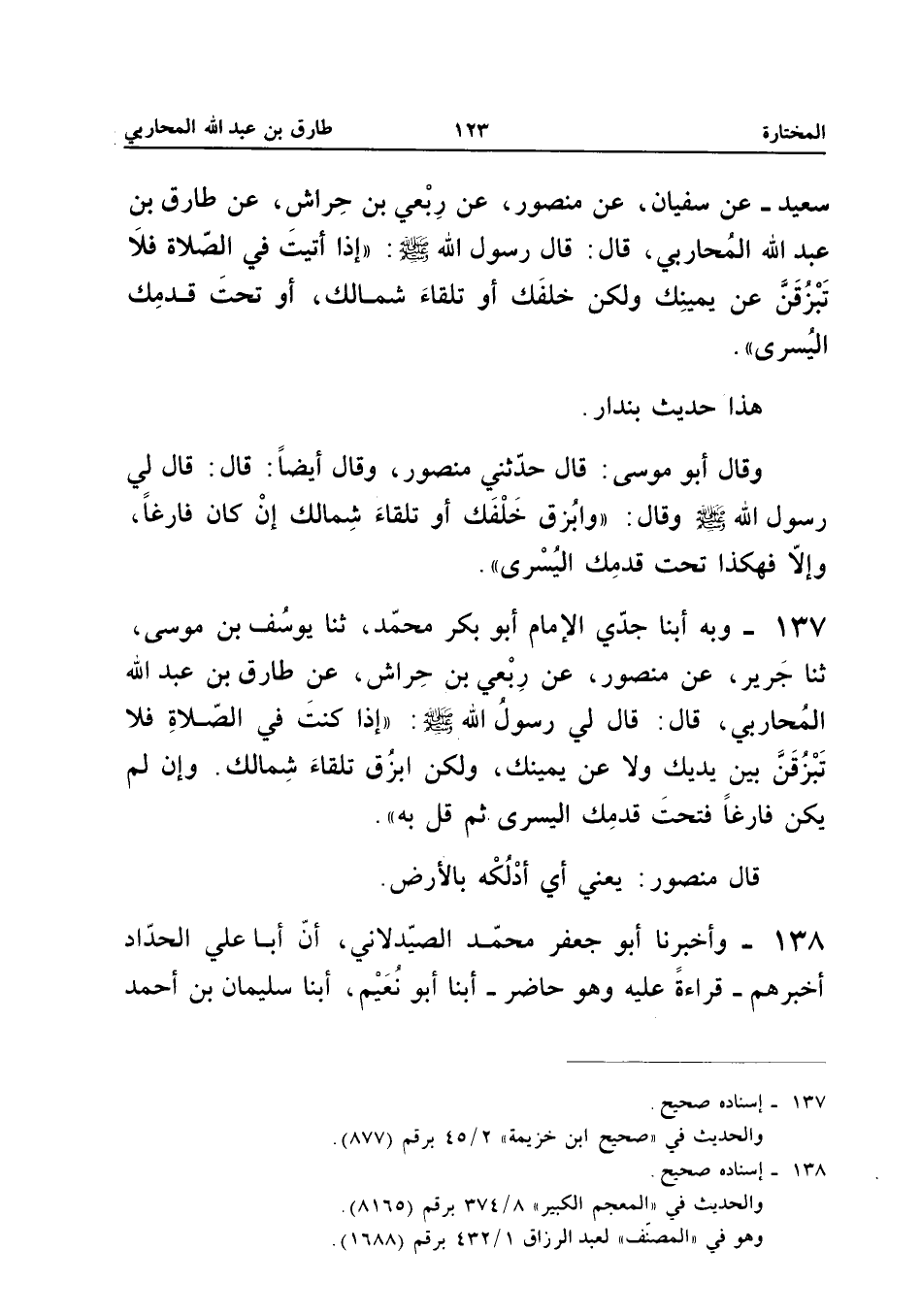 الطَّبَرَانِيُّ، ثَنَا إِسْحَاقُ بْنُ إِبْرَاهِيمَ الدَّبَرِيُّ، أَبْنَا عَبْدُ الرَّزَّاقِ، أَبْنَا الثَّوْرِيُّ، عَنْ مَنْصُورٍ، عَنْ رِبْعِيِّ بْنِ حِرَاشٍ، عَنْ طَارِقِ بْنِ عَبْدِ اللهِ الْمُحَارِبِيِّ قَالَ: قَالَ رَسُولُ اللهِ - صَلَّى اللهُ عَلَيْهِ وَسَلَّمَ -: («إِذَا صَلَّيْتَ فَلَا تَبْصُقْ بَيْنَ يَدَيْكَ وَلَا عَنْ يَمِينِكَ، وَابْصُقْ تِلْقَاءَ شِمَالِكَ إِنْ كَانَ فَارِغًا، وَإِلَّا فَتَحْتَ قَدَمِكَ). وَأَشَارَ بِرِجْلِهِ فَفَحَصَ الْأَرْضَ».
