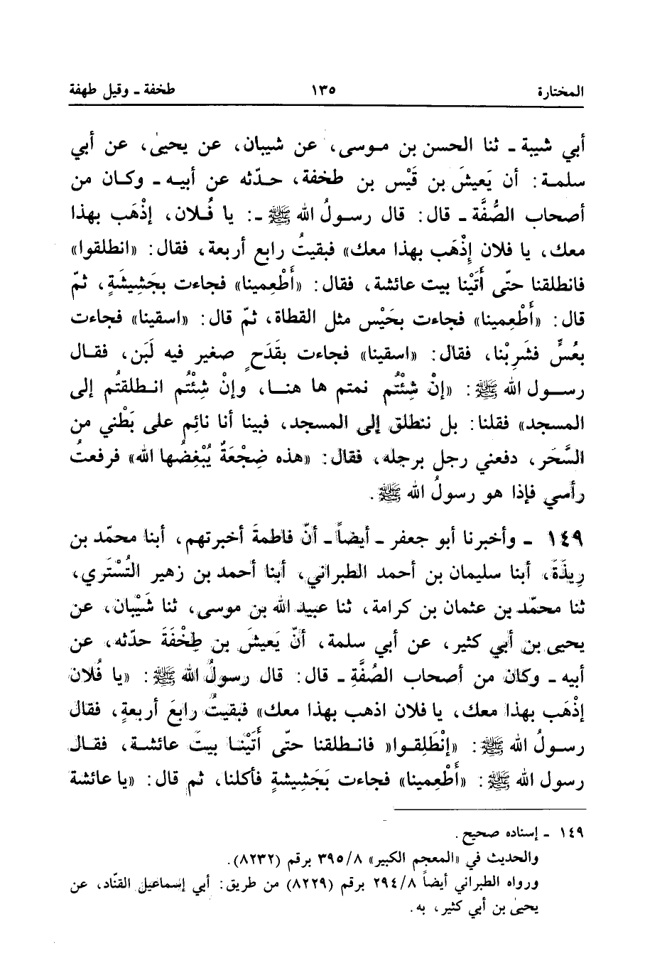 ١٤٩ - وَأَخْبَرَنَا أَبُو جَعْفَرٍ - أَيْضًا - أَنَّ فَاطِمَةَ أَخْبَرَتْهُمْ، أَبْنَا مُحَمَّدُ بْنُ رِيذَةَ، أَبْنَا سُلَيْمَانُ بْنُ أَحْمَدَ الطَّبَرَانِيُّ، أَبْنَا أَحْمَدُ بْنُ زُهَيْرٍ التُّسْتَرِيُّ، ثَنَا مُحَمَّدُ بْنُ عُثْمَانَ بْنِ كَرَامَةَ، ثَنَا عُبَيْدُ اللهِ بْنُ مُوسَى، ثَنَا شَيْبَانُ، عَنْ يَحْيَى بْنِ أَبِي كَثِيرٍ، عَنْ أَبِي سَلَمَةَ أَنَّ يَعِيشَ بْنَ طَخْفَةَ حَدَّثَهُ، عَنْ أَبِيهِ - وَكَانَ مِنْ أَصْحَابِ الصُّفَّةِ - قَالَ: قَالَ رَسُولُ اللهِ - صَلَّى اللهُ عَلَيْهِ وَسَلَّمَ -: «(يَا فُلَانُ اذْهَبْ بِهَذَا مَعَكَ، يَا فُلَانُ اذْهَبْ بِهَذَا مَعَكَ) فَبَقِيتُ رَابِعَ أَرْبَعَةٍ، فَقَالَ رَسُولُ اللهِ - صَلَّى اللهُ عَلَيْهِ وَسَلَّمَ -: (انْطَلِقُوا) فَانْطَلَقْنَا حَتَّى أَتَيْنَا بَيْتَ عَائِشَةَ، فَقَالَ رَسُولُ اللهِ - صَلَّى اللهُ عَلَيْهِ وَسَلَّمَ -: (أَطْعِمِينَا) فَجَاءَتْ بِجَشِيشَةٍ فَأَكَلْنَا، ثُمَّ قَالَ: (يَا عَائِشَةُ