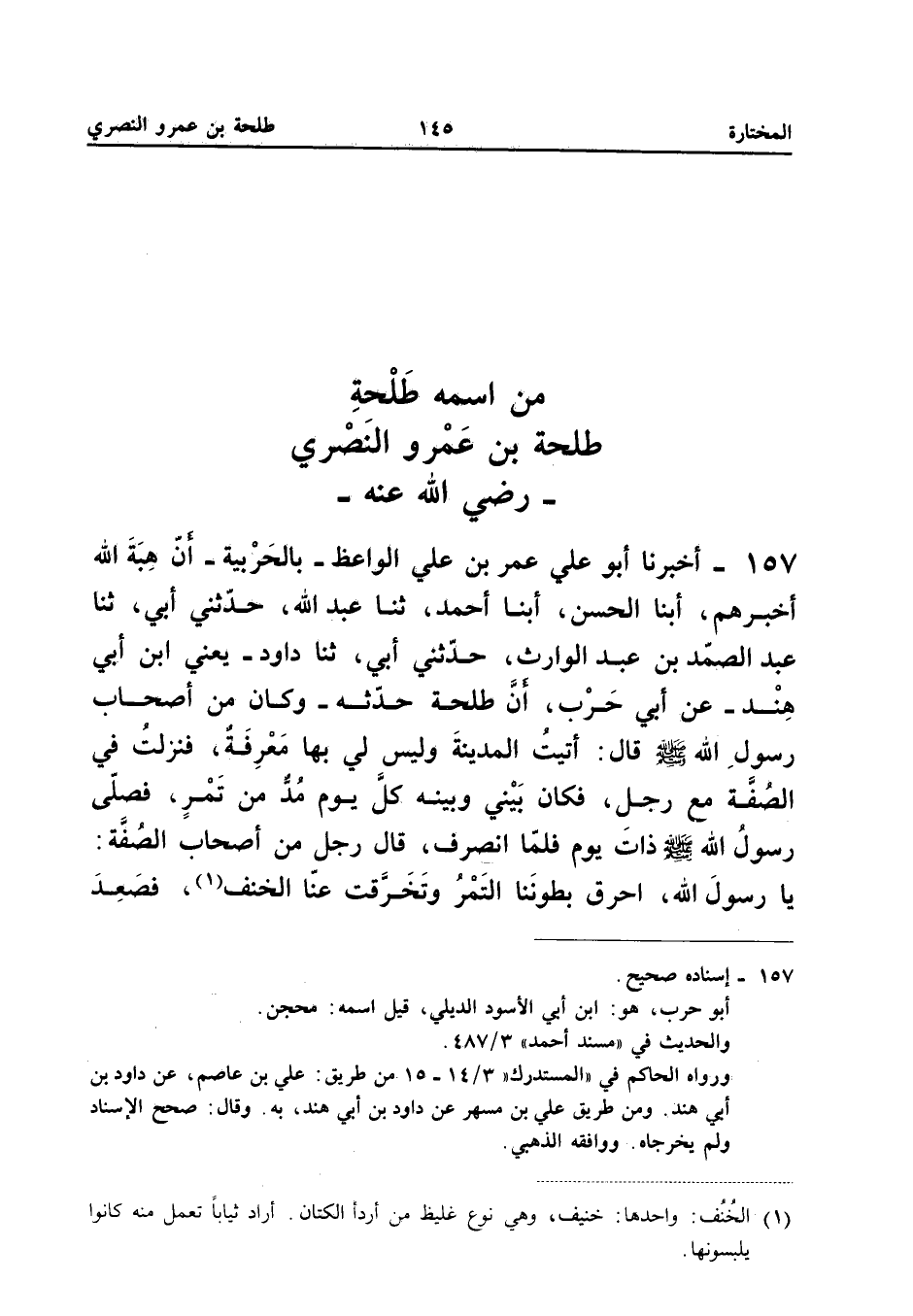 ١٥٧ - أَخْبَرَنَا أَبُو عَلِيٍّ عُمَرُ بْنُ عَلِيٍّ الْوَاعِظُ - بِالْحَرْبِيَّةِ - أَنَّ هِبَةَ اللهِ أَخْبَرَهُمْ، أَبْنَا الْحَسَنُ، أَبْنَا أَحْمَدُ، ثَنَا عَبْدُ اللهِ، حَدَّثَنِي أَبِي، ثَنَا عَبْدُ الصَّمَدِ بْنُ عَبْدِ الْوَارِثِ، حَدَّثَنِي أَبِي، ثَنَا دَاوُدُ - يَعْنِي ابْنَ أَبِي هِنْدٍ - عَنْ أَبِي حَرْبٍ، أَنَّ طَلْحَةَ حَدَّثَهُ - وَكَانَ مِنْ أَصْحَابِ رَسُولِ اللهِ - صَلَّى اللهُ عَلَيْهِ وَسَلَّمَ - قَالَ: «أَتَيْتُ الْمَدِينَةَ وَلَيْسَ لِي بِهَا مَعْرِفَةٌ، فَنَزَلْتُ فِي الصُّفَّةِ مَعَ رَجُلٍ، فَكَانَ بَيْنِي وَبَيْنَهُ كُلَّ يَوْمٍ مُدٌّ مِنْ تَمْرٍ، فَصَلَّى رَسُولُ اللهِ - صَلَّى اللهُ عَلَيْهِ وَسَلَّمَ - ذَاتَ يَوْمٍ فَلَمَّا انْصَرَفَ، قَالَ رَجُلٌ مِنْ أَصْحَابِ الصُّفَّةِ: يَا رَسُولَ اللهِ، أَحْرَقَ بُطُونَنَا التَّمْرُ وَتَخَرَّقَتْ عَنَّا الْخُنُفُ، فَصَعِدَ