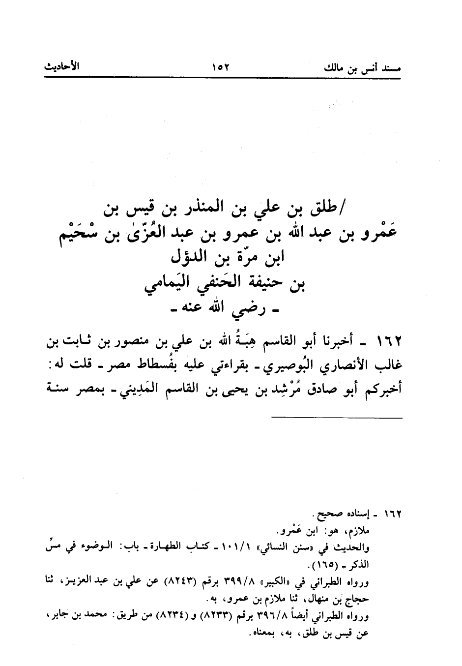 سَبْعَ عَشْرَةَ وَخَمْسِمِائَةٍ فَأَقَرَّ بِهِ - قَالَ: أَبْنَا أَبُو الْحَسَنِ مُحَمَّدُ بْنُ الْحُسَيْنِ بْنِ مُحَمَّدِ بْنِ الْحُسَيْنِ النَّيْسَابُورِيُّ، ثَنَا أَبُو الْحَسَنِ مُحَمَّدُ بْنُ عَبْدِ اللهِ بْنِ زَكَرِيَّا بْنِ حَيُّوَيْهِ النَّيْسَابُورِيُّ، لَفْظًا، ثَنَا أَبُو عَبْدِ الرَّحْمَنِ أَحْمَدُ بْنُ شُعَيْبِ بْنِ عَلِيِّ بْنِ سِنَانِ بْنِ بَحْرٍ النَّسَائِيُّ، أَبْنَا هَنَّادُ بْنُ السَّرِيِّ، عَنْ مُلَازِمٍ قَالَ: حَدَّثَنِي عَبْدُ اللهِ بْنُ بَدْرٍ، عَنْ قَيْسِ بْنِ طَلْقٍ، عَنْ أَبِيهِ طَلْقِ بْنِ عَلِيٍّ قَالَ: «خَرَجْنَا وَفْدًا حَتَّى قَدِمْنَا عَلَى نَبِيِّ اللهِ - صَلَّى اللهُ عَلَيْهِ وَسَلَّمَ - فَبَايَعْنَاهُ وَصَلَّيْنَا مَعَهُ، فَلَمَّا قَضَيْنَا الصَّلَاةَ جَاءَ رَجُلٌ كَأَنَّهُ بَدَوِيٌّ، فَقَالَ: يَا نَبِيَّ اللهِ، مَا تَرَى فِي رَجُلٍ مَسَّ ذَكَرَهُ فِي الصَّلَاةِ، قَالَ: (وَهَلْ هُوَ إِلَّا مُضْغَةٌ مِنْهُ؟ ) أَوْ (بَضْعَةٌ مِنْهُ»؟ ).