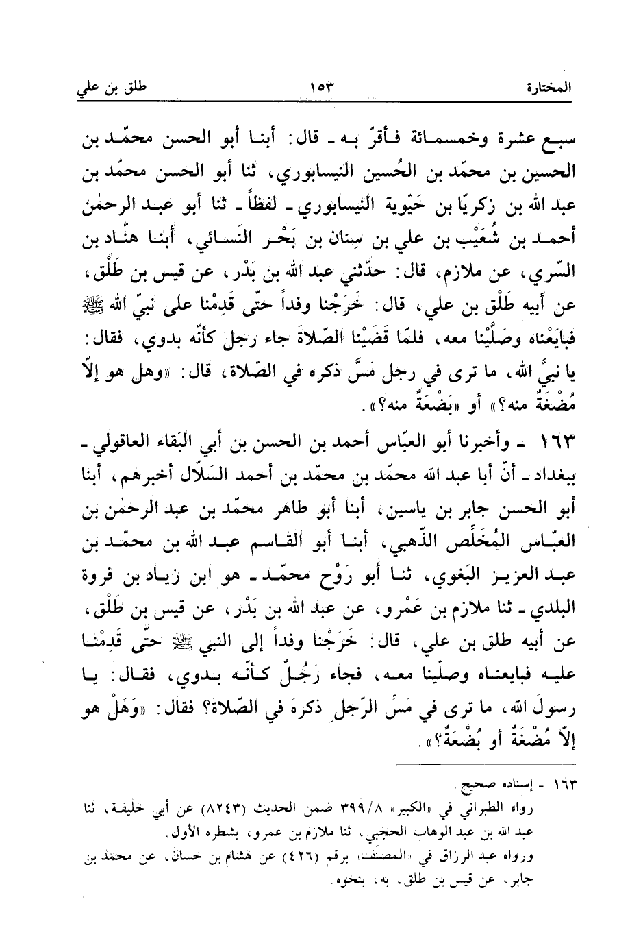 ١٦٣ - وَأَخْبَرَنَا أَبُو الْعَبَّاسِ أَحْمَدُ بْنُ الْحَسَنِ بْنِ أَبِي الْبَقَاءِ الْعَاقُولِيُّ - بِبَغْدَادَ - أَنَّ أَبَا عَبْدِ اللهِ مُحَمَّدَ بْنَ مُحَمَّدِ بْنِ أَحْمَدَ السَّلَّالَ أَخْبَرَهُمْ، أَبْنَا أَبُو الْحَسَنِ جَابِرُ بْنُ يَاسِينَ، أَبْنَا أَبُو طَاهِرٍ مُحَمَّدُ بْنُ عَبْدِ الرَّحْمَنِ بْنِ الْعَبَّاسِ الْمُخَلِّصُ الذَّهَبِيُّ، أَبْنَا أَبُو الْقَاسِمِ عَبْدُ اللهِ بْنُ مُحَمَّدِ بْنِ عَبْدِ الْعَزِيزِ الْبَغَوِيُّ، ثَنَا أَبُو رَوْحٍ مُحَمَّدٌ - هُوَ ابْنُ زِيَادِ بْنِ فَرْوَةَ الْبَلَدِيُّ -، ثَنَا مُلَازِمُ بْنُ عَمْرٍو، عَنْ عَبْدِ اللهِ بْنِ بَدْرٍ، عَنْ قَيْسِ بْنِ طَلْقٍ، عَنْ أَبِيهِ طَلْقِ بْنِ عَلِيٍّ، قَالَ: «خَرَجْنَا وَفْدًا إِلَى النَّبِيِّ - صَلَّى اللهُ عَلَيْهِ وَسَلَّمَ - حَتَّى قَدِمْنَا عَلَيْهِ فَبَايَعْنَاهُ وَصَلَّيْنَا مَعَهُ، فَجَاءَ رَجُلٌ كَأَنَّهُ بَدَوِيٌّ، فَقَالَ: يَا رَسُولَ اللهِ، مَا تَرَى فِي مَسِّ الرَّجُلِ ذَكَرَهُ فِي الصَّلَاةِ؟ فَقَالَ: (وَهَلْ هُوَ إِلَّا مُضْغَةٌ أَوْ بَضْعَةٌ؟ ).