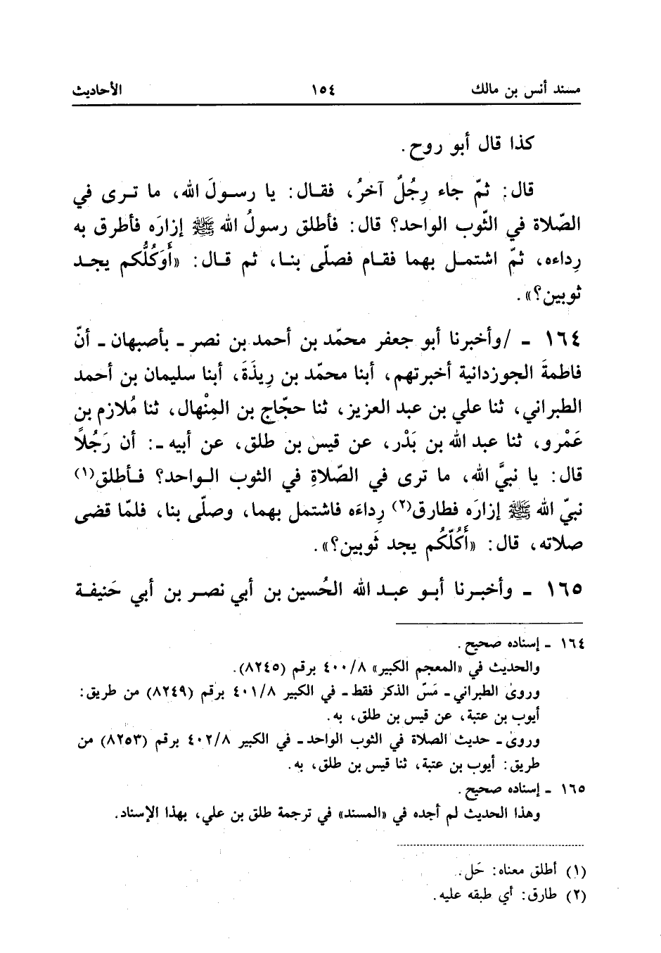 ١٦٤ - وَأَخْبَرَنَا أَبُو جَعْفَرٍ مُحَمَّدُ بْنُ أَحْمَدَ بْنِ نَصْرٍ - بِأَصْبَهَانَ - أَنَّ فَاطِمَةَ الْجُوزْدَانِيَّةَ أَخْبَرَتْهُمْ، أَبْنَا مُحَمَّدُ بْنُ رِيذَةَ، أَبْنَا سُلَيْمَانُ بْنُ أَحْمَدَ الطَّبَرَانِيُّ، ثَنَا عَلِيُّ بْنُ عَبْدِ الْعَزِيزِ، ثَنَا حَجَّاجُ بْنُ الْمِنْهَالِ، ثَنَا مُلَازِمُ بْنُ عَمْرٍو، ثَنَا عَبْدُ اللهِ بْنُ بَدْرٍ، عَنْ قَيْسِ بْنِ طَلْقٍ، عَنْ أَبِيهِ: «أَنَّ رَجُلًا قَالَ: يَا نَبِيَّ اللهِ، مَا تَرَى فِي الصَّلَاةِ فِي الثَّوْبِ الْوَاحِدِ؟ فَأَطْلَقَ نَبِيُّ اللهِ - صَلَّى اللهُ عَلَيْهِ وَسَلَّمَ - إِزَارَهُ فَطَارَقَ رِدَاءَهُ فَاشْتَمَلَ بِهِمَا، وَصَلَّى بِنَا، فَلَمَّا قَضَى صَلَاتَهُ قَالَ: (أَكُلُّكُمْ يَجِدُ ثَوْبَيْنِ»؟ ).