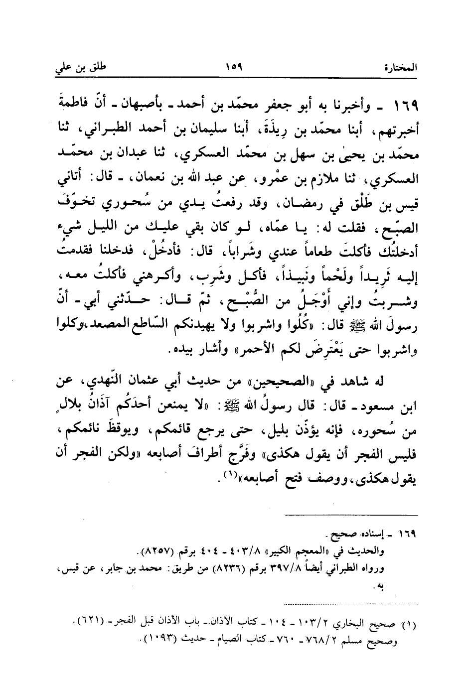 ١٦٩ - وَأَخْبَرَنَا بِهِ أَبُو جَعْفَرٍ مُحَمَّدُ بْنُ أَحْمَدَ - بِأَصْبَهَانَ - أَنَّ فَاطِمَةَ أَخْبَرَتْهُمْ، أَبْنَا مُحَمَّدُ بْنُ رِيذَةَ، أَبْنَا سُلَيْمَانُ بْنُ أَحْمَدَ الطَّبَرَانِيُّ، ثَنَا مُحَمَّدُ بْنُ يَحْيَى بْنِ سَهْلِ بْنِ مُحَمَّدٍ الْعَسْكَرِيُّ، ثَنَا عَبْدَانُ بْنُ مُحَمَّدٍ الْعَسْكَرِيُّ، ثَنَا مُلَازِمُ بْنُ عَمْرٍو، عَنْ عَبْدِ اللهِ بْنِ نُعْمَانَ قَالَ: «أَتَانِي قَيْسُ بْنُ طَلْقٍ فِي رَمَضَانَ، وَقَدْ رَفَعْتُ يَدِي مِنْ سُحُورِي تَخَوُّفَ الصُّبْحِ، فَقُلْتُ لَهُ: يَا عَمَّاهُ لَوْ كَانَ بَقِيَ عَلَيْكَ مِنَ اللَّيْلِ شَيْءٌ أَدْخَلْتُكَ فَأَكَلْتَ طَعَامًا عِنْدِي وَشَرَابًا، قَالَ: فَأُدْخِلَ، فَدَخَلْنَا فَقَدَّمْتُ إِلَيْهِ ثَرِيدًا وَلَحْمًا وَنَبِيذًا، فَأَكَلَ وَشَرِبَ، وَأَكْرَهَنِي فَأَكَلْتُ مَعَهُ وَشَرِبْتُ وَإِنِّي أَوْجَلُ مِنَ الصُّبْحِ، ثُمَّ قَالَ: حَدَّثَنِي أَبِي: أَنَّ رَسُولَ اللهِ - صَلَّى اللهُ عَلَيْهِ وَسَلَّمَ - قَالَ: (كُلُوا وَاشْرَبُوا وَلَا يَهِيدَنَّكُمُ السَّاطِعُ الْمُصْعَدُ، وَكُلُوا وَاشْرَبُوا حَتَّى يَعْتَرِضَ لَكُمُ الْأَحْمَرُ) وَأَشَارَ بِيَدِهِ».