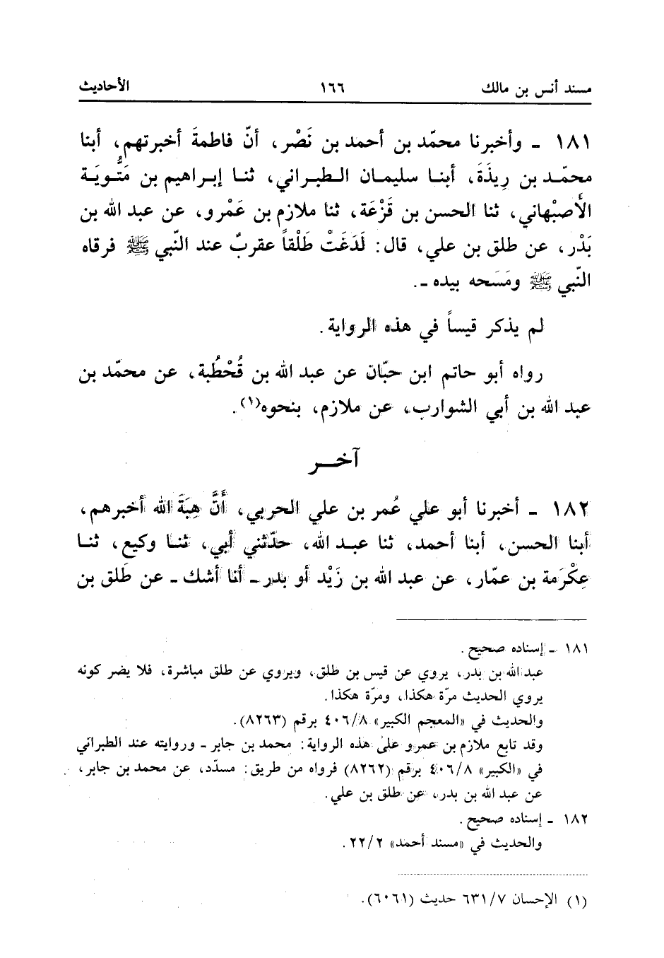١٨١ - وَأَخْبَرَنَا مُحَمَّدُ بْنُ أَحْمَدَ بْنِ نَصْرٍ، أَنَّ فَاطِمَةَ أَخْبَرَتْهُمْ، أَبْنَا مُحَمَّدُ بْنُ رِيذَةَ، أَبْنَا سُلَيْمَانُ الطَّبَرَانِيُّ، ثَنَا إِبْرَاهِيمُ بْنُ مَتُّوَيْهِ الْأَصْبَهَانِيُّ، ثَنَا الْحَسَنُ بْنُ قَزَعَةَ، ثَنَا مُلَازِمُ بْنُ عَمْرٍو، عَنْ عَبْدِ اللهِ بْنِ بَدْرٍ، عَنْ طَلْقِ بْنِ عَلِيٍّ قَالَ: «لَدَغَتْ طَلْقًا عَقْرَبٌ عِنْدَ النَّبِيِّ - صَلَّى اللهُ عَلَيْهِ وَسَلَّمَ - فَرَقَاهُ النَّبِيُّ - صَلَّى اللهُ عَلَيْهِ وَسَلَّمَ - وَمَسَحَهُ بِيَدِهِ».