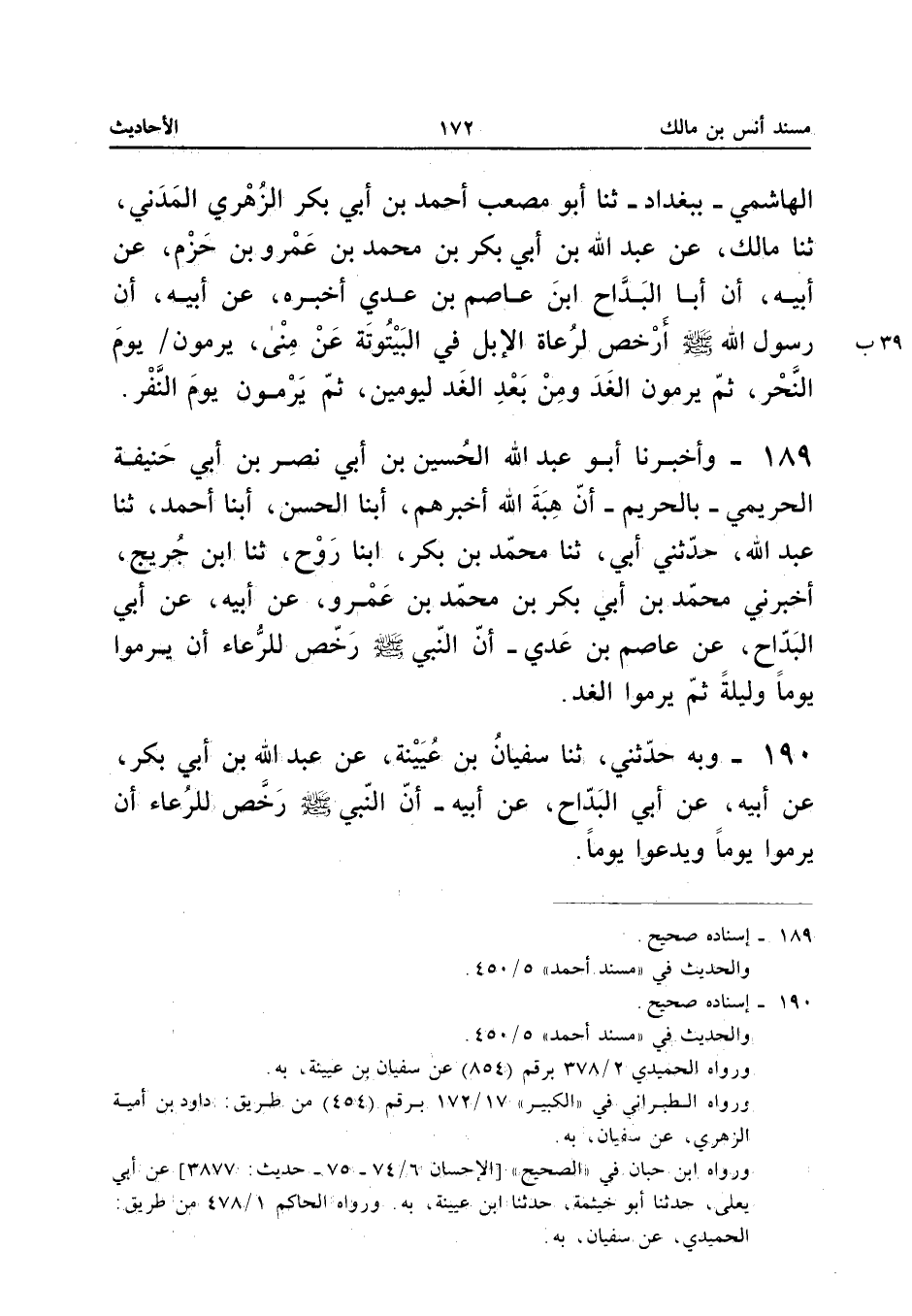 ١٨٩ - وَأَخْبَرَنَا أَبُو عَبْدِ اللهِ الْحُسَيْنُ بْنُ أَبِي نَصْرِ بْنِ أَبِي حَنِيفَةَ الْحَرِيمِيُّ - بِالْحَرِيمِ - أَنَّ هِبَةَ اللهِ أَخْبَرَهُمْ، أَبْنَا الْحَسَنُ، أَبْنَا أَحْمَدُ، ثَنَا عَبْدُ اللهِ، حَدَّثَنِي أَبِي، ثَنَا مُحَمَّدُ بْنُ بَكْرٍ، أَبْنَا رَوْحٌ، ثَنَا ابْنُ جُرَيْجٍ أَخْبَرَنِي مُحَمَّدُ بْنُ أَبِي بَكْرِ بْنِ مُحَمَّدِ بْنِ عَمْرٍو، عَنْ أَبِيهِ، عَنْ أَبِي الْبَدَّاحِ، عَنْ عَاصِمِ بْنِ عَدِيٍّ: «أَنَّ النَّبِيَّ - صَلَّى اللهُ عَلَيْهِ وَسَلَّمَ - رَخَّصَ لِلرِّعَاءِ أَنْ يَرْمُوا يَوْمًا وَلَيْلَةً ثُمَّ يَرْمُوا الْغَدَ».