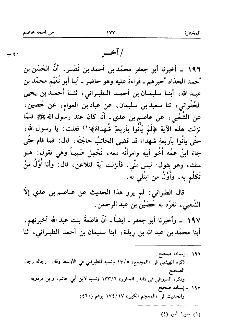 ١٩٦ - أَخْبَرَنَا أَبُو جَعْفَرٍ مُحَمَّدُ بْنُ أَحْمَدَ بْنِ نَصْرٍ، أَنَّ الْحَسَنَ بْنَ أَحْمَدَ الْحَدَّادَ أَخْبَرَهُمْ - قِرَاءَةً عَلَيْهِ وَهُوَ حَاضِرٌ - أَبْنَا أَبُو نُعَيْمٍ مُحَمَّدُ بْنُ عَبْدِ اللهِ (¬١)، أَبْنَا سُلَيْمَانُ بْنُ أَحْمَدَ الطَّبَرَانِيُّ، ثَنَا أَحْمَدُ بْنُ يَحْيَى الْحُلْوَانِيُّ، ثَنَا سَعِيدُ بْنُ سُلَيْمَانَ، عَنْ عَبَّادِ بْنِ الْعَوَّامِ، عَنْ حُصَيْنٍ، عَنِ الشَّعْبِيِّ، عَنْ عَاصِمِ بْنِ عَدِيٍّ: «أَنَّهُ كَانَ عِنْدَ رَسُولِ اللهِ - صَلَّى اللهُ عَلَيْهِ وَسَلَّمَ - فَلَمَّا نَزَلَتْ هَذِهِ الْآيَةُ {لَمْ يَأْتُوا بِأَرْبَعَةِ شُهَدَاءَ} فَقُلْتُ: يَا رَسُولَ اللهِ، حَتَّى يَأْتُوا بِأَرْبَعَةِ شُهَدَاءَ قَدْ قَضَى الْخَائِبُ حَاجَتَهُ، قَالَ: فَمَا قَامَ حَتَّى جَاءَ ابْنُ عَمِّهِ أَخُو أَبِيهِ، وَامْرَأَتُهُ مَعَهُ تَحْمِلُ صَبِيًّا وَهِيَ تَقُولُ: هُوَ مِنْكَ، وَهُوَ يَقُولُ: لَيْسَ مِنِّي، فَأُنْزِلَتْ آيَةُ التَّلَاعُنِ، قَالَ: وَأَنَا أَوَّلُ مَنْ تَكَلَّمَ بِهِ، وَأَوَّلُ مَنِ ابْتُلِيَ بِهِ».