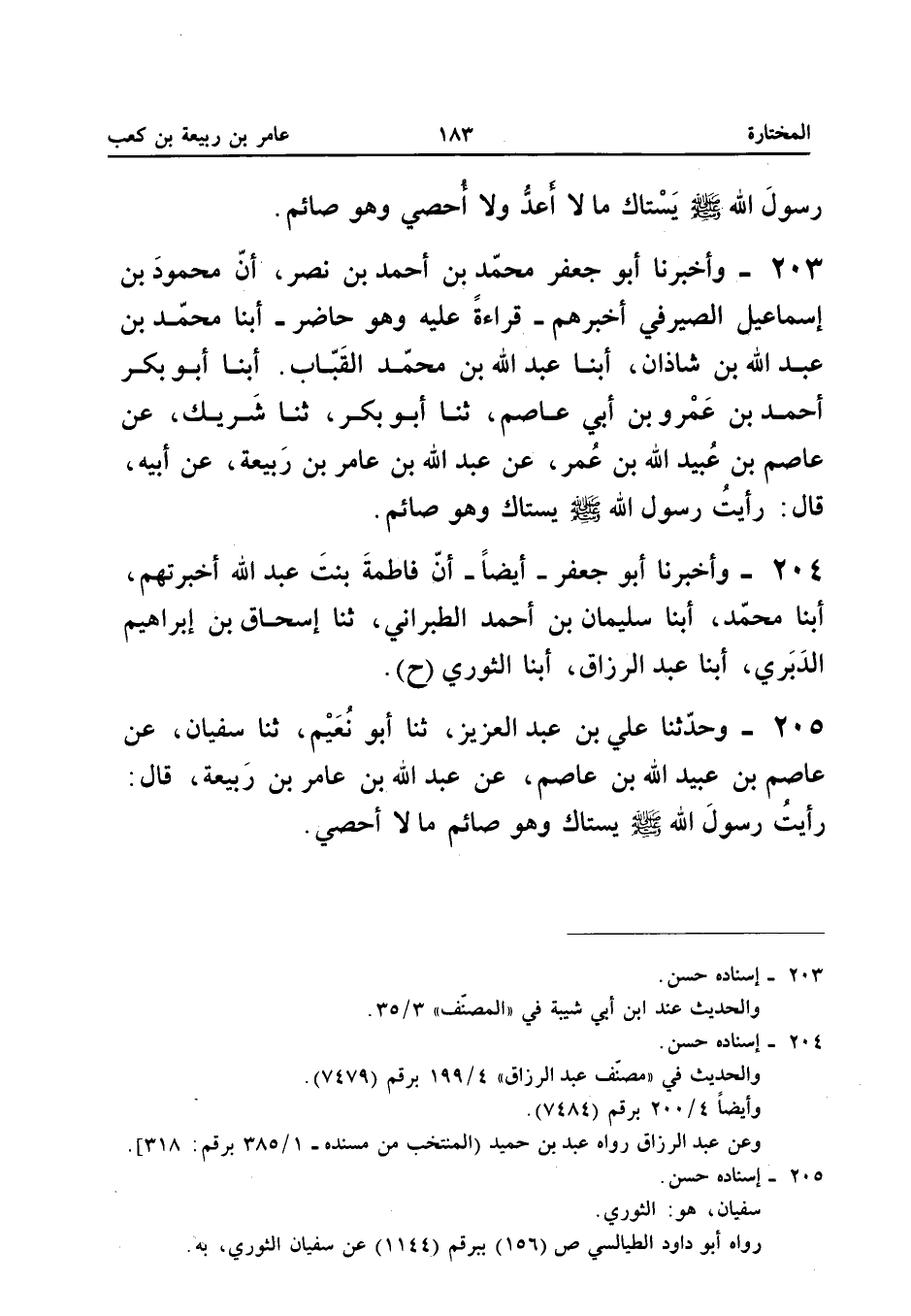 ٢٠٣ - وَأَخْبَرَنَا أَبُو جَعْفَرٍ مُحَمَّدُ بْنُ أَحْمَدَ بْنِ نَصْرٍ، أَنَّ مَحْمُودَ بْنَ إِسْمَاعِيلَ الصَّيْرَفِيَّ أَخْبَرَهُمْ - قِرَاءَةً عَلَيْهِ وَهُوَ حَاضِرٌ - أَبْنَا مُحَمَّدُ بْنُ عَبْدِ اللهِ بْنِ شَاذَانَ، أَبْنَا عَبْدُ اللهِ بْنُ مُحَمَّدٍ الْقَبَّابُ، أَبْنَا أَبُو بَكْرٍ أَحْمَدُ بْنُ عَمْرِو بْنِ أَبِي عَاصِمٍ، ثَنَا أَبُو بَكْرٍ، ثَنَا شَرِيكٌ، عَنْ عَاصِمِ بْنِ عُبَيْدِ اللهِ بْنِ عُمَرَ، عَنْ عَبْدِ اللهِ بْنِ عَامِرِ بْنِ رَبِيعَةَ، عَنْ أَبِيهِ قَالَ: «رَأَيْتُ رَسُولَ اللهِ - صَلَّى اللهُ عَلَيْهِ وَسَلَّمَ - يَسْتَاكُ وَهُوَ صَائِمٌ».