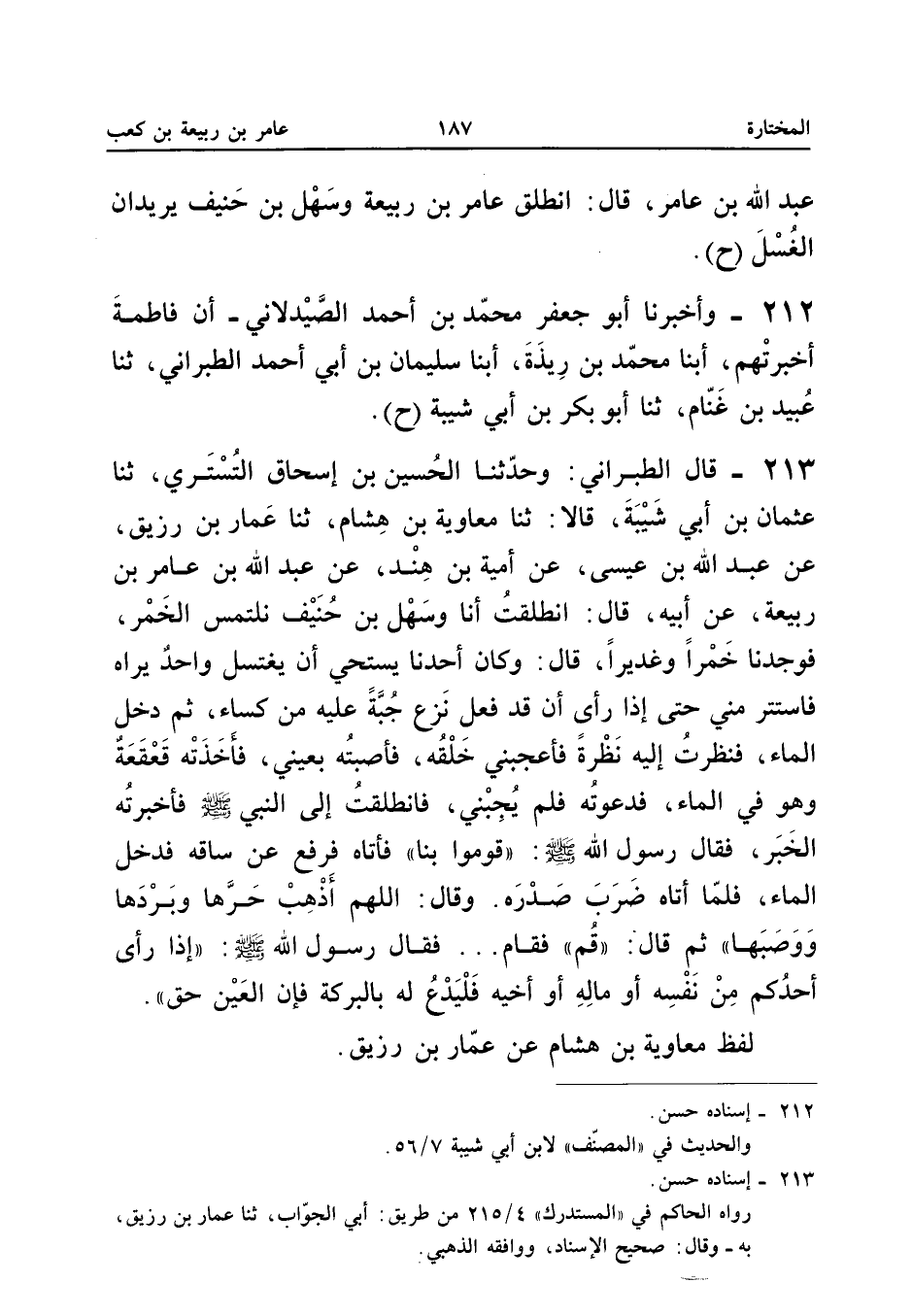 ٢١٣ - قَالَ الطَّبَرَانِيُّ: وَحَدَّثَنَا الْحُسَيْنُ بْنُ إِسْحَاقَ التُّسْتَرِيُّ، ثَنَا عُثْمَانُ بْنُ أَبِي شَيْبَةَ قَالَا: ثَنَا مُعَاوِيَةُ بْنُ هِشَامٍ، ثَنَا عَمَّارُ بْنُ رُزَيْقٍ، عَنْ عَبْدِ اللهِ بْنِ عِيسَى، عَنْ أُمَيَّةَ بْنِ هِنْدٍ، عَنْ عَبْدِ اللهِ بْنِ عَامِرِ بْنِ رَبِيعَةَ، عَنْ أَبِيهِ قَالَ: «انْطَلَقْتُ أَنَا وَسَهْلُ بْنُ حُنَيْفٍ نَلْتَمِسُ الْخَمَرَ، فَوَجَدْنَا خَمَرًا وَغَدِيرًا، قَالَ: وَكَانَ أَحَدُنَا يَسْتَحِي أَنْ يَغْتَسِلَ وَأَحَدٌ يَرَاهُ، فَاسْتَتَرَ مِنِّي حَتَّى إِذَا رَأَى أَنْ قَدْ فَعَلَ نَزَعَ جُبَّةً عَلَيْهِ مِنْ كِسَاءٍ، ثُمَّ دَخَلَ الْمَاءَ، فَنَظَرْتُ إِلَيْهِ نَظْرَةً فَأَعْجَبَنِي خَلْقُهُ، فَأَصَبْتُهُ بِعَيْنِي، فَأَخَذَتْهُ قَعْقَعَةٌ وَهُوَ فِي الْمَاءِ، فَدَعَوْتُهُ فَلَمْ يُجِبْنِي، فَانْطَلَقْتُ إِلَى النَّبِيِّ - صَلَّى اللهُ عَلَيْهِ وَسَلَّمَ - فَأَخْبَرْتُهُ الْخَبَرَ، فَقَالَ رَسُولُ اللهِ - صَلَّى اللهُ عَلَيْهِ وَسَلَّمَ -: (قُومُوا بِنَا) فَأَتَاهُ فَرَفَعَ عَنْ سَاقِهِ فَدَخَلَ الْمَاءَ، فَلَمَّا أَتَاهُ ضَرَبَ صَدْرَهُ وَقَالَ: اللَّهُمَّ أَذْهِبْ حَرَّهَا وَبَرْدَهَا وَوَصَبَهَا ثُمَّ قَالَ: (قُمْ) فَقَامَ، فَقَالَ رَسُولُ اللهِ - صَلَّى اللهُ عَلَيْهِ وَسَلَّمَ -: (إِذَا رَأَى أَحَدُكُمْ مِنْ نَفْسِهِ أَوْ مَالِهِ أَوْ أَخِيهِ فَلْيَدْعُ لَهُ بِالْبَرَكَةِ فَإِنَّ الْعَيْنَ حَقٌّ»).
