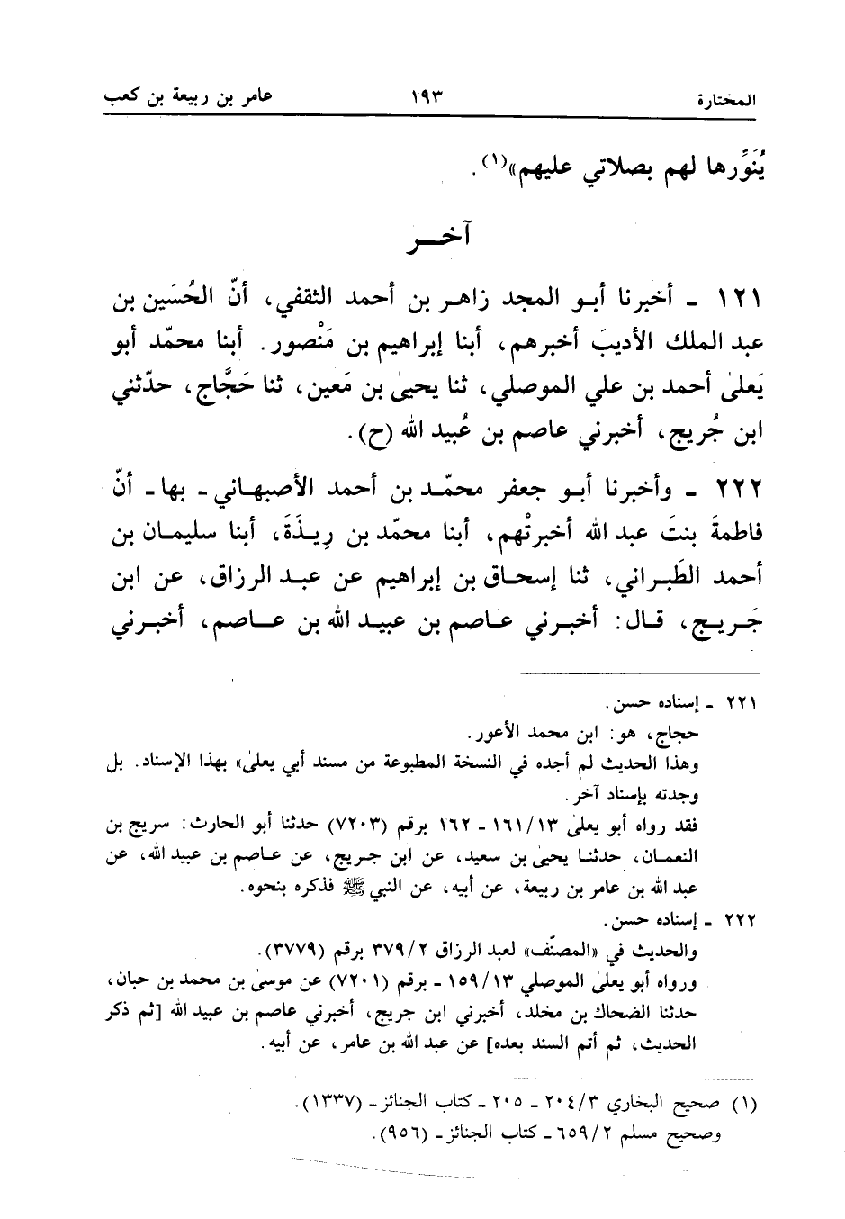 ٢٢١ - أَخْبَرَنَا أَبُو الْمَجْدِ زَاهِرُ بْنُ أَحْمَدَ الثَّقَفِيُّ، أَنَّ الْحُسَيْنَ بْنَ عَبْدِ الْمَلِكِ الْأَدِيبَ أَخْبَرَهُمْ، أَبْنَا إِبْرَاهِيمُ بْنُ مَنْصُورٍ، أَبْنَا مُحَمَّدٌ أَبُو يَعْلَى أَحْمَدُ بْنُ عَلِيٍّ الْمَوْصِلِيُّ (¬١)، ثَنَا يَحْيَى بْنُ مَعِينٍ، ثَنَا حَجَّاجٌ، حَدَّثَنِي ابْنُ جُرَيْجٍ، أَخْبَرَنِي عَاصِمُ بْنُ عُبَيْدِ اللهِ (ح).