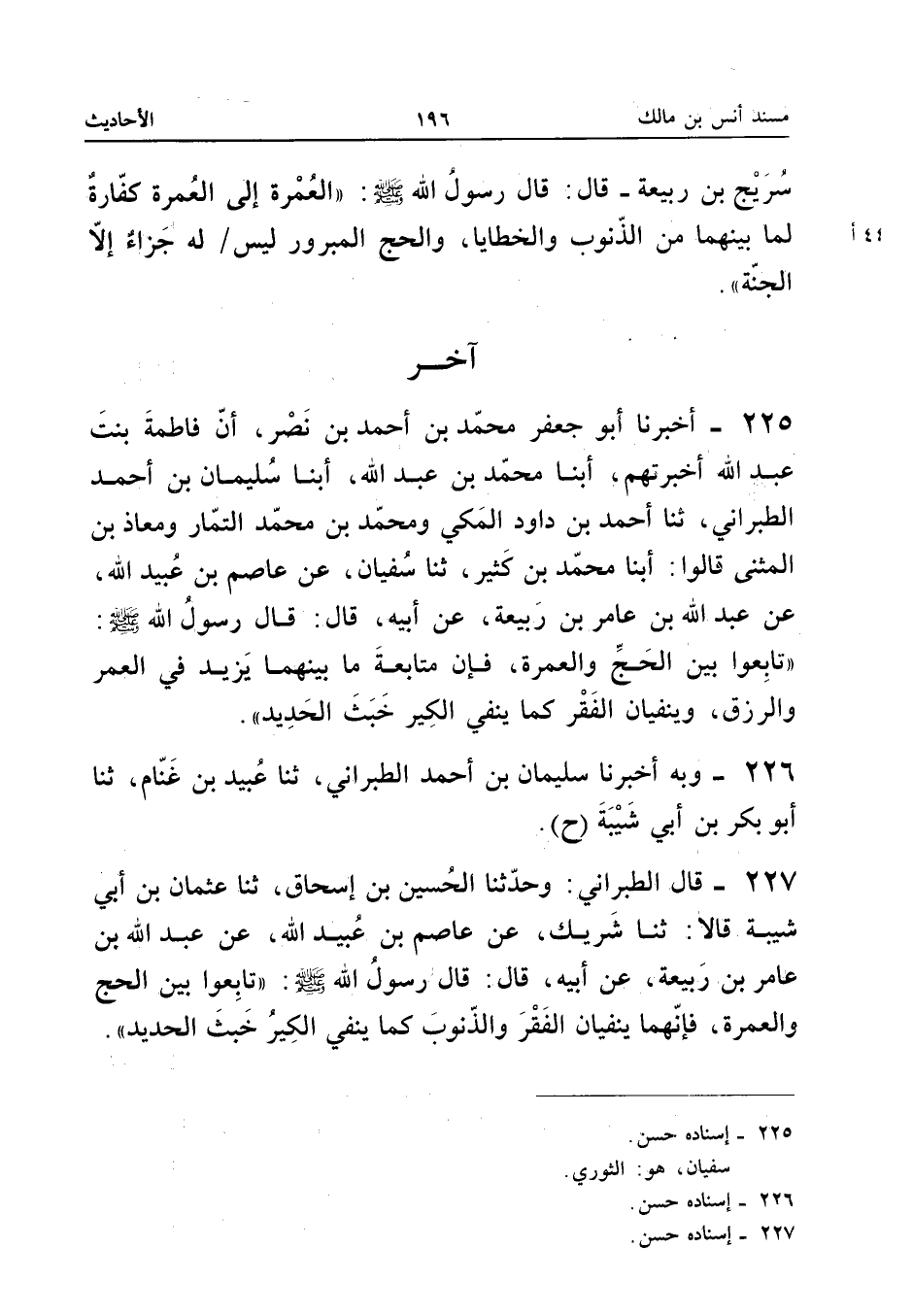 ٢٢٥ - أَخْبَرَنَا أَبُو جَعْفَرٍ مُحَمَّدُ بْنُ أَحْمَدَ بْنِ نَصْرٍ، أَنَّ فَاطِمَةَ بِنْتَ عَبْدِ اللهِ أَخْبَرَتْهُمْ، أَبْنَا مُحَمَّدُ بْنُ عَبْدِ اللهِ، أَبْنَا سُلَيْمَانُ بْنُ أَحْمَدَ الطَّبَرَانِيُّ، ثَنَا أَحْمَدُ بْنُ دَاوُدَ الْمَكِّيُّ وَمُحَمَّدُ بْنُ مُحَمَّدٍ التَّمَّارُ وَمُعَاذُ بْنُ الْمُثَنَّى قَالُوا: أَبْنَا مُحَمَّدُ بْنُ كَثِيرٍ، ثَنَا سُفْيَانُ، عَنْ عَاصِمِ بْنِ عُبَيْدِ اللهِ، عَنْ عَبْدِ اللهِ بْنِ عَامِرِ بْنِ رَبِيعَةَ، عَنْ أَبِيهِ قَالَ: قَالَ رَسُولُ اللهِ - صَلَّى اللهُ عَلَيْهِ وَسَلَّمَ -: («تَابِعُوا بَيْنَ الْحَجِّ وَالْعُمْرَةِ، فَإِنَّ مُتَابَعَةَ مَا بَيْنَهُمَا يَزِيدُ فِي الْعُمُرِ وَالرِّزْقِ، وَيَنْفِيَانِ الْفَقْرَ كَمَا يَنْفِي الْكِيرُ خَبَثَ الْحَدِيدِ»).