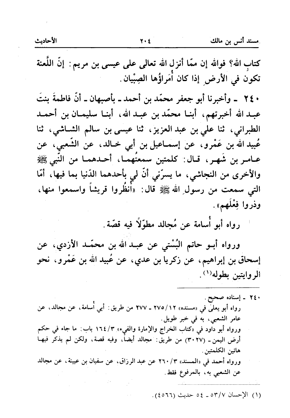 ٢٤٠ - وَأَخْبَرَنَا أَبُو جَعْفَرٍ مُحَمَّدُ بْنُ أَحْمَدَ - بِأَصْبَهَانَ - أَنَّ فَاطِمَةَ بِنْتَ عَبْدِ اللهِ أَخْبَرَتْهُمْ، أَبْنَا مُحَمَّدُ بْنُ عَبْدِ اللهِ، أَبْنَا سُلَيْمَانُ بْنُ أَحْمَدَ الطَّبَرَانِيُّ، ثَنَا عَلِيُّ بْنُ عَبْدِ الْعَزِيزِ، ثَنَا عِيسَى بْنُ سَالِمٍ الشَّاشِيُّ، ثَنَا عُبَيْدُ اللهِ بْنُ عَمْرٍو، عَنْ إِسْمَاعِيلَ بْنِ أَبِي خَالِدٍ، عَنِ الشَّعْبِيِّ، عَنْ عَامِرِ بْنِ شَهْرٍ قَالَ: «كَلِمَتَيْنِ سَمِعْتُهُمَا؛ أَحَدُهُمَا مِنَ النَّبِيِّ - صَلَّى اللهُ عَلَيْهِ وَسَلَّمَ - وَالْأُخْرَى مِنَ النَّجَاشِيِّ، مَا يَسُرُّنِي أَنَّ لِي بِأَحَدِهِمَا الدُّنْيَا بِمَا فِيهَا، أَمَّا الَّتِي سَمِعْتُ مِنْ رَسُولِ اللهِ - صَلَّى اللهُ عَلَيْهِ وَسَلَّمَ - قَالَ: (انْظُرُوا قُرَيْشًا وَاسْمَعُوا مِنْهَا، وَذَرُوا فِعْلَهُمْ»).