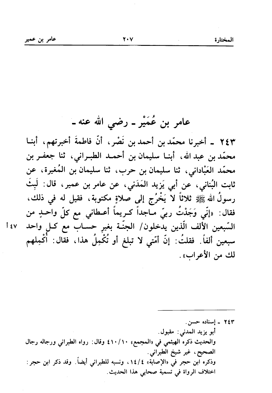 ٢٤٣ - أَخْبَرَنَا مُحَمَّدُ بْنُ أَحْمَدَ بْنِ نَصْرٍ، أَنَّ فَاطِمَةَ أَخْبَرَتْهُمْ، أَبْنَا مُحَمَّدُ بْنُ عَبْدِ اللهِ، أَبْنَا سُلَيْمَانُ بْنُ أَحْمَدَ الطَّبَرَانِيُّ، ثَنَا جَعْفَرُ بْنُ مُحَمَّدٍ الْعَبَّادَانِيُّ، ثَنَا سُلَيْمَانُ بْنُ حَرْبٍ، ثَنَا سُلَيْمَانُ بْنُ الْمُغِيرَةِ، عَنْ ثَابِتٍ الْبُنَانِيِّ، عَنْ أَبِي يَزِيدَ الْمَدَنِيِّ، عَنْ عَامِرِ بْنِ عُمَيْرٍ قَالَ: «لَبِثَ رَسُولُ اللهِ - صَلَّى اللهُ عَلَيْهِ وَسَلَّمَ - ثَلَاثًا لَا يَخْرُجُ إِلَى صَلَاةٍ مَكْتُوبَةٍ، فَقِيلَ لَهُ فِي ذَلِكَ فَقَالَ: (إِنِّي وَجَدْتُ رَبِّي مَاجِدًا كَرِيمًا أَعْطَانِي مَعَ كُلِّ وَاحِدٍ مِنَ السَّبْعِينَ الْأَلْفِ الَّذِينَ يَدْخُلُونَ الْجَنَّةَ بِغَيْرِ حِسَابٍ مَعَ كُلِّ وَاحِدٍ سَبْعِينَ أَلْفًا، فَقُلْتُ: إِنَّ أُمَّتِي لَا تَبْلُغُ أَوْ تُكْمِلُ هَذَا، فَقَالَ: أُكْمِلُهُمْ لَكَ مِنَ الْأَعْرَابِ»).