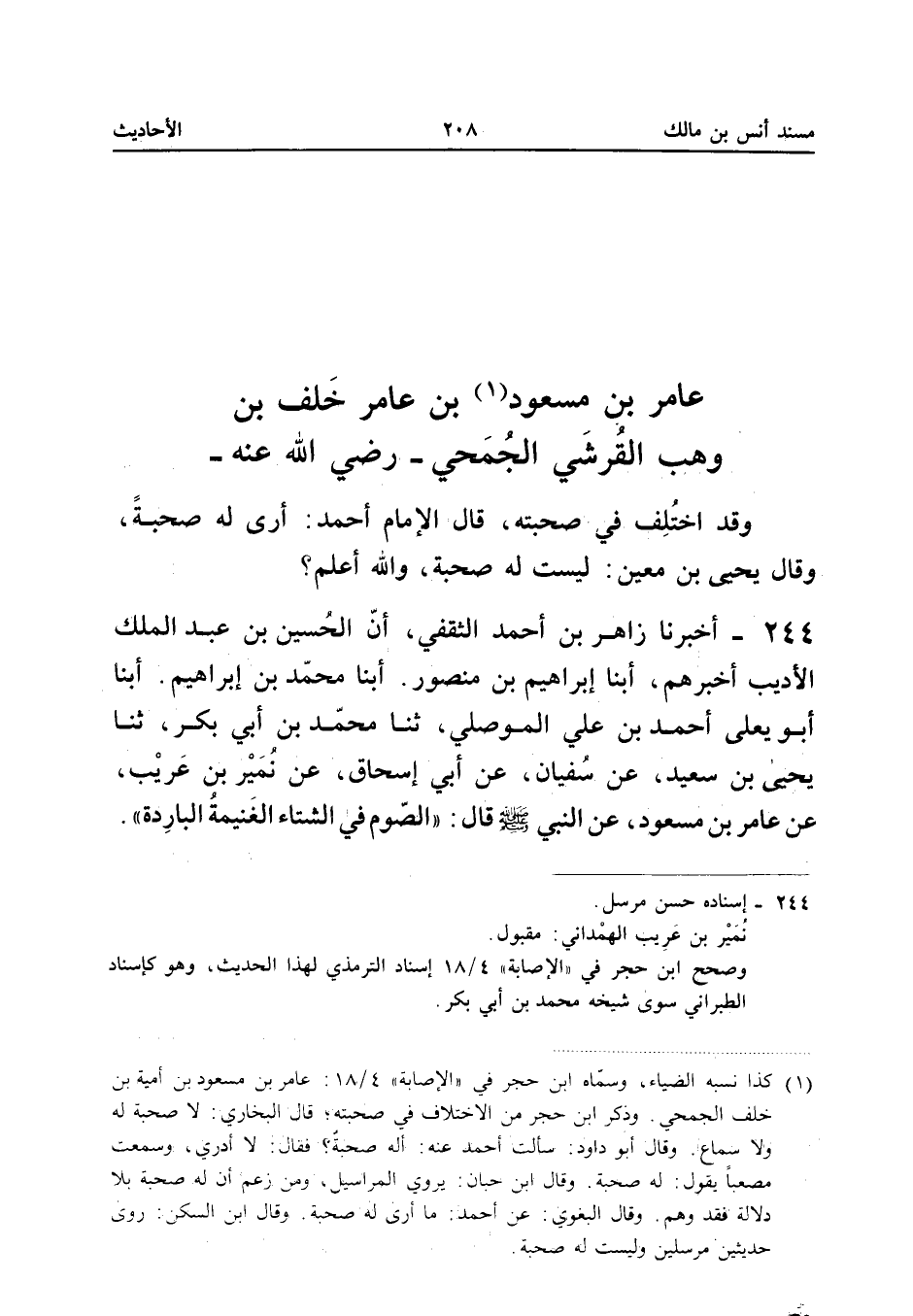 ٢٤٤ - أَخْبَرَنَا زَاهِرُ بْنُ أَحْمَدَ الثَّقَفِيُّ، أَنَّ الْحُسَيْنَ بْنَ عَبْدِ الْمَلِكِ الْأَدِيبَ أَخْبَرَهُمْ، أَبْنَا إِبْرَاهِيمُ بْنُ مَنْصُورٍ، أَبْنَا مُحَمَّدُ بْنُ إِبْرَاهِيمَ، أَبْنَا أَبُو يَعْلَى أَحْمَدُ بْنُ عَلِيٍّ الْمَوْصِلِيُّ، ثَنَا مُحَمَّدُ بْنُ أَبِي بَكْرٍ، ثَنَا يَحْيَى بْنُ سَعِيدٍ، عَنْ سُفْيَانَ، عَنْ أَبِي إِسْحَاقَ، عَنْ نُمَيْرِ بْنِ عَرِيبٍ، عَنْ عَامِرِ بْنِ مَسْعُودٍ، عَنِ النَّبِيِّ - صَلَّى اللهُ عَلَيْهِ وَسَلَّمَ - قَالَ: («الصَّوْمُ فِي الشِّتَاءِ الْغَنِيمَةُ الْبَارِدَةُ»).