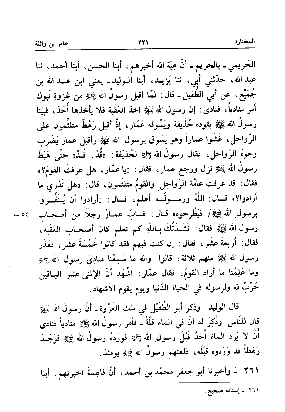 مُحَمَّدٌ، أَبْنَا سُلَيْمَانُ بْنُ أَحْمَدَ الطَّبَرَانِيُّ، ثَنَا عَبْدُ اللهِ بْنُ مُحَمَّدِ بْنِ الْعَبَّاسِ الْأَصْفَهَانِيُّ، ثَنَا أَبُو مَسْعُودٍ أَحْمَدُ بْنُ الْفُرَاتِ، ثَنَا عُبَيْدُ اللهِ بْنُ مُوسَى، ثَنَا الْوَلِيدُ بْنُ عَبْدِ اللهِ بْنِ جُمَيْعٍ، عَنْ أَبِي الطُّفَيْلِ قَالَ: «خَرَجَ رَسُولُ اللهِ - صَلَّى اللهُ عَلَيْهِ وَسَلَّمَ - فِي غَزْوَةِ تَبُوكَ، فَانْتَهَى إِلَى عَقَبَةٍ فَأَمَرَ مُنَادِيَهُ فَنَادَى: لَا يَأْخُذَنَّ الْعَقَبَةَ أَحَدٌ، فَإِنَّ رَسُولَ اللهِ - صَلَّى اللهُ عَلَيْهِ وَسَلَّمَ - يَأْخُذُهَا، فَكَانَ رَسُولُ اللهِ - صَلَّى اللهُ عَلَيْهِ وَسَلَّمَ - يَسِيرُ وَحُذَيْفَةُ يَقُودُهُ، وَعَمَّارٌ يَسُوقُهُ، فَأَقْبَلَ رَهْطٌ مُتَلَثِّمِينَ عَلَى الرَّوَاحِلِ حَتَّى غَشَوُا النَّبِيَّ - صَلَّى اللهُ عَلَيْهِ وَسَلَّمَ -؛ فَرَجَعَ عَمَّارٌ فَضَرَبَ وُجُوهَ الرَّوَاحِلِ، فَقَالَ النَّبِيُّ - صَلَّى اللهُ عَلَيْهِ وَسَلَّمَ - لِحُذَيْفَةَ: (قُدْ قُدْ) فَلَحِقَهُ عَمَّارٌ، فَقَالَ: (سُقْ سُقْ) حَتَّى أَنَاخَ، فَقَالَ لِعَمَّارٍ: (هَلْ تَعْرِفُ الْقَوْمَ؟ ) فَقَالَ: لَا، كَانُوا مُتَلَثِّمِينَ وَقَدْ عَرَفْتُ عَامَّةَ الرَّوَاحِلِ، فَقَالَ: (أَتَدْرِي مَا أَرَادُوا بِرَسُولِ اللهِ - صَلَّى اللهُ عَلَيْهِ وَسَلَّمَ -؟ ) قُلْتُ: اللهُ وَرَسُولُهُ أَعْلَمُ، قَالَ: (أَرَادُوا أَنْ يَمْكُرُوا بِرَسُولِ اللهِ - صَلَّى اللهُ عَلَيْهِ وَسَلَّمَ - فَيَطْرَحُوهُ مِنَ الْعَقَبَةِ)؛ فَلَمَّا كَانَ بَعْدَ ذَلِكَ نَزَعَ بَيْنَ عَمَّارٍ وَبَيْنَ رَجُلٍ مِنْهُمْ شَيْءٌ مِمَّا يَكُونُ بَيْنَ النَّاسِ، فَقَالَ: أَنْشُدُكَ بِاللهِ، كَمْ أَصْحَابُ الْعَقَبَةِ الَّذِينَ أَرَادُوا أَنْ يَمْكُرُوا بِرَسُولِ اللهِ - صَلَّى اللهُ عَلَيْهِ وَسَلَّمَ -؟ فَقَالَ: تَرَى أَنَّهُمْ أَرْبَعَةَ عَشَرَ، فَإِنْ كُنْتَ فِيهِمْ فَكَانُوا خَمْسَةَ عَشَرَ، وَيَشْهَدُ عَمَّارٌ أَنَّ مِنْهُمُ اثْنَيْ عَشَرَ حَرْبًا لِلهِ وَرَسُولِهِ فِي الْحَيَاةِ الدُّنْيَا وَيَوْمَ يَقُومُ الْأَشْهَادُ».