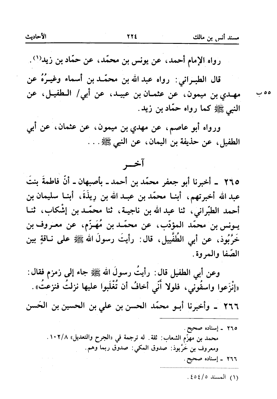 ٢٦٥ - أَخْبَرَنَا أَبُو جَعْفَرٍ مُحَمَّدُ بْنُ أَحْمَدَ - بِأَصْبَهَانَ - أَنَّ فَاطِمَةَ بِنْتَ عَبْدِ اللهِ أَخْبَرَتْهُمْ، أَبْنَا مُحَمَّدُ بْنُ عَبْدِ اللهِ بْنِ رِيذَةَ، أَبْنَا سُلَيْمَانُ بْنُ أَحْمَدَ الطَّبَرَانِيُّ، ثَنَا عَبْدُ اللهِ ابْنُ نَاجِيَةَ، ثَنَا مُحَمَّدُ بْنُ إِشْكَابَ، ثَنَا يُونُسُ بْنُ مُحَمَّدٍ الْمُؤَدِّبُ، عَنْ مُحَمَّدِ بْنِ مِهْزَمٍ، عَنْ مَعْرُوفِ بْنِ خَرَّبُوذَ، عَنْ أَبِي الطُّفَيْلِ قَالَ: «رَأَيْتُ رَسُولَ اللهِ - صَلَّى اللهُ عَلَيْهِ وَسَلَّمَ - عَلَى نَاقَةٍ بَيْنَ الصَّفَا وَالْمَرْوَةِ».