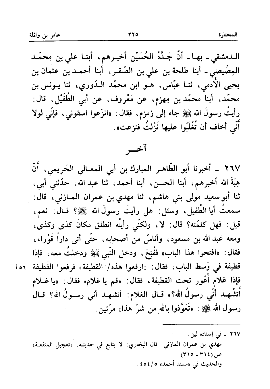 ٢٦٨ - أَخْبَرَنَا أَبُو الطَّاهِرِ الْمُبَارَكُ بْنُ أَبِي الْمَعَالِي الْحَرِيمِيُّ، أَنَّ هِبَةَ اللهِ أَخْبَرَهُمْ، أَبْنَا الْحَسَنُ، أَبْنَا أَحْمَدُ، ثَنَا عَبْدُ اللهِ، حَدَّثَنِي أَبِي، ثَنَا أَبُو سَعِيدٍ مَوْلَى بَنِي هَاشِمٍ، ثَنَا مَهْدِيُّ بْنُ عِمْرَانَ الْمَازِنِيُّ قَالَ: سَمِعْتُ أَبَا الطُّفَيْلِ «وَسُئِلَ: هَلْ رَأَيْتَ رَسُولَ اللهِ - صَلَّى اللهُ عَلَيْهِ وَسَلَّمَ -؟ قَالَ: نَعَمْ، قِيلَ: فَهَلْ كَلَّمْتَهُ؟ قَالَ: لَا، وَلَكِنِّي رَأَيْتُهُ انْطَلَقَ مَكَانَ كَذَا وَكَذَا، وَمَعَهُ عَبْدُ اللهِ بْنُ مَسْعُودٍ وَأُنَاسٌ مِنْ أَصْحَابِهِ، حَتَّى أَتَى دَارًا قَوْرَاءَ فَقَالَ: (افْتَحُوا هَذَا الْبَابَ) فَفُتِحَ، وَدَخَلَ النَّبِيُّ - صَلَّى اللهُ عَلَيْهِ وَسَلَّمَ - وَدَخَلْتُ مَعَهُ، فَإِذَا قَطِيفَةٌ فِي وَسَطِ الْبَابِ فَقَالَ: (ارْفَعُوا هَذِهِ الْقَطِيفَةَ) فَرَفَعُوا الْقَطِيفَةَ فَإِذَا غُلَامٌ أَعْوَرُ تَحْتَ الْقَطِيفَةِ، فَقَالَ: (قُمْ يَا غُلَامُ) فَقَالَ: (يَا غُلَامُ أَتَشْهَدُ أَنِّي رَسُولُ اللهِ؟ ) قَالَ الْغُلَامُ: أَتَشْهَدُ أَنِّي رَسُولُ اللهِ؟ قَالَ رَسُولُ اللهِ - صَلَّى اللهُ عَلَيْهِ وَسَلَّمَ -: (تَعَوَّذُوا بِاللهِ مِنْ شَرِّ هَذَا) مَرَّتَيْنِ».