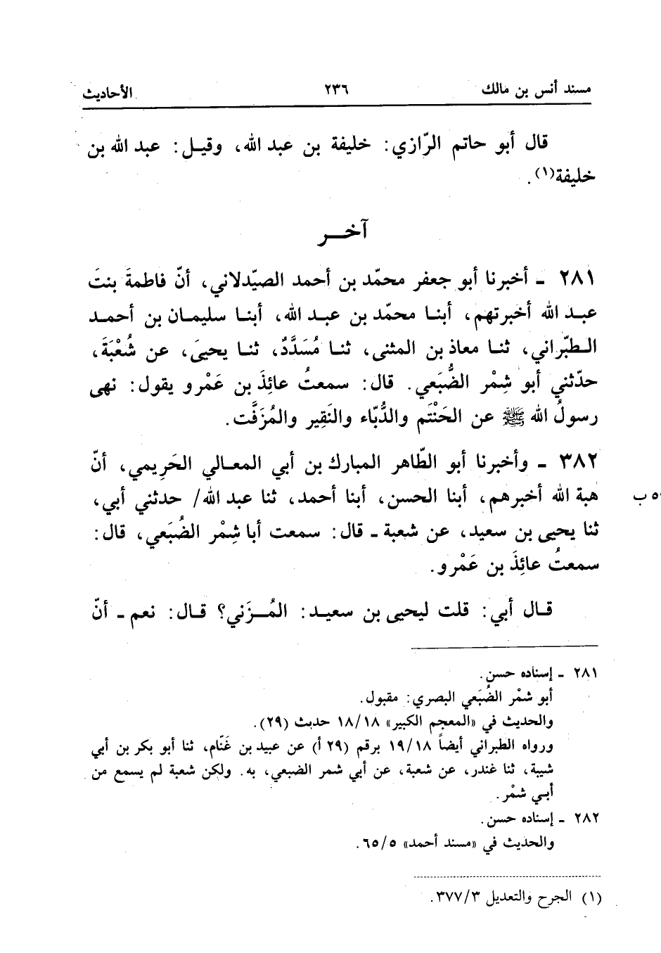 ٢٨٢ - وَأَخْبَرَنَا أَبُو الطَّاهِرِ الْمُبَارَكُ بْنُ أَبِي الْمَعَالِي الْحَرِيمِيُّ، أَنَّ هِبَةَ اللهِ أَخْبَرَهُمْ، أَبْنَا الْحَسَنُ، أَبْنَا أَحْمَدُ، ثَنَا عَبْدُ اللهِ، حَدَّثَنِي أَبِي، ثَنَا يَحْيَى بْنُ سَعِيدٍ، عَنْ شُعْبَةَ قَالَ: سَمِعْتُ أَبَا شِمْرٍ الضُّبَعِيَّ قَالَ: سَمِعْتُ عَائِذَ بْنَ عَمْرٍو.