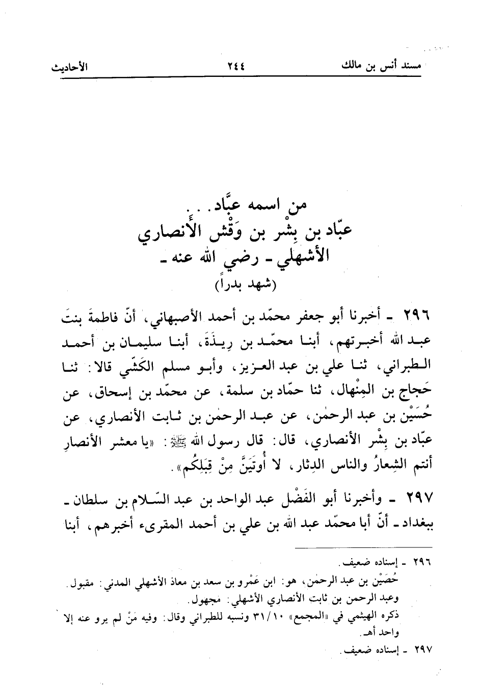 ٢٩٦ - أَخْبَرَنَا أَبُو جَعْفَرٍ مُحَمَّدُ بْنُ أَحْمَدَ الْأَصْبَهَانِيُّ، أَنَّ فَاطِمَةَ بِنْتَ عَبْدِ اللهِ أَخْبَرَتْهُمْ، أَبْنَا مُحَمَّدُ بْنُ رِيذَةَ، أَبْنَا سُلَيْمَانُ بْنُ أَحْمَدَ الطَّبَرَانِيُّ، ثَنَا عَلِيُّ بْنُ عَبْدِ الْعَزِيزِ وَأَبُو مُسْلِمٍ الْكَشِّيُّ قَالَا: ثَنَا حَجَّاجُ بْنُ الْمِنْهَالِ، ثَنَا حَمَّادُ بْنُ سَلَمَةَ، عَنْ مُحَمَّدِ بْنِ إِسْحَاقَ، عَنْ حُسَيْنِ بْنِ عَبْدِ الرَّحْمَنِ، عَنْ عَبْدِ الرَّحْمَنِ بْنِ ثَابِتٍ الْأَنْصَارِيِّ، عَنْ عَبَّادِ بْنِ بِشْرٍ الْأَنْصَارِيِّ قَالَ: قَالَ رَسُولُ اللهِ - صَلَّى اللهُ عَلَيْهِ وَسَلَّمَ -: («يَا مَعْشَرَ الْأَنْصَارِ أَنْتُمُ الشِّعَارُ وَالنَّاسُ الدِّثَارُ، لَا أُوتَيَنَّ مِنْ قِبَلِكُمْ»).