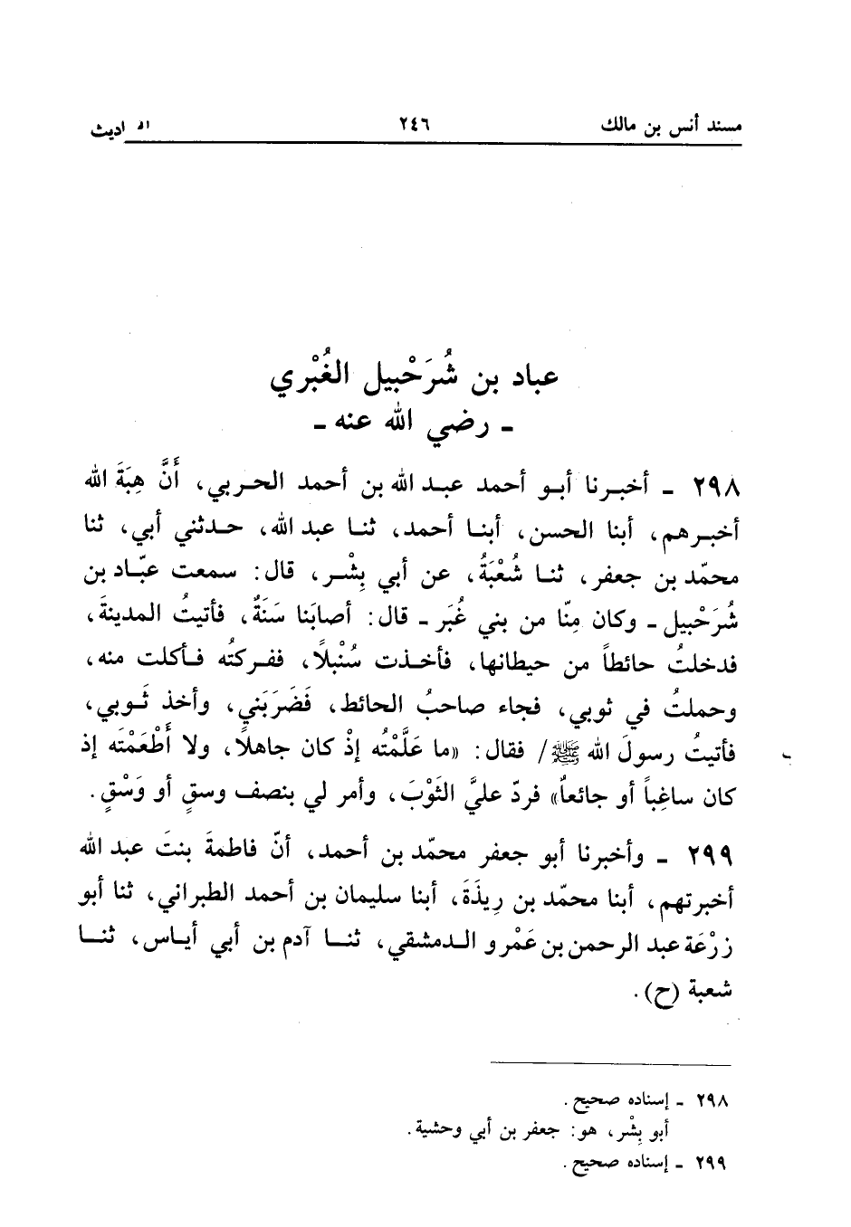 ٢٩٨ - أَخْبَرَنَا أَبُو أَحْمَدَ عَبْدُ اللهِ بْنُ أَحْمَدَ الْحَرْبِيُّ (¬١)، أَنَّ هِبَةَ اللهِ أَخْبَرَهُمْ، أَبْنَا الْحَسَنُ، أَبْنَا أَحْمَدُ، ثَنَا عَبْدُ اللهِ، حَدَّثَنِي أَبِي، ثَنَا مُحَمَّدُ بْنُ جَعْفَرٍ، ثَنَا شُعْبَةُ، عَنْ أَبِي بِشْرٍ قَالَ: سَمِعْتُ عَبَّادَ بْنَ شُرَحْبِيلَ - وَكَانَ مِنَّا مِنْ بَنِي غُبَرَ - قَالَ: «أَصَابَنَا سَنَةٌ فَأَتَيْتُ الْمَدِينَةَ، فَدَخَلْتُ حَائِطًا مِنْ حِيطَانِهَا، فَأَخَذْتُ سُنْبُلًا فَفَرَكْتُهُ فَأَكَلْتُ مِنْهُ، وَحَمَلْتُ فِي ثَوْبِي، فَجَاءَ صَاحِبُ الْحَائِطِ فَضَرَبَنِي وَأَخَذَ ثَوْبِي، فَأَتَيْتُ رَسُولَ اللهِ - صَلَّى اللهُ عَلَيْهِ وَسَلَّمَ - فَقَالَ: (مَا عَلَّمْتَهُ إِذْ كَانَ جَاهِلًا، وَلَا أَطْعَمْتَهُ إِذْ كَانَ سَاغِبًا أَوْ جَائِعًا) فَرَدَّ عَلَيَّ الثَّوْبَ، وَأَمَرَ لِي بِنِصْفِ وَسْقٍ أَوْ وَسْقٍ».