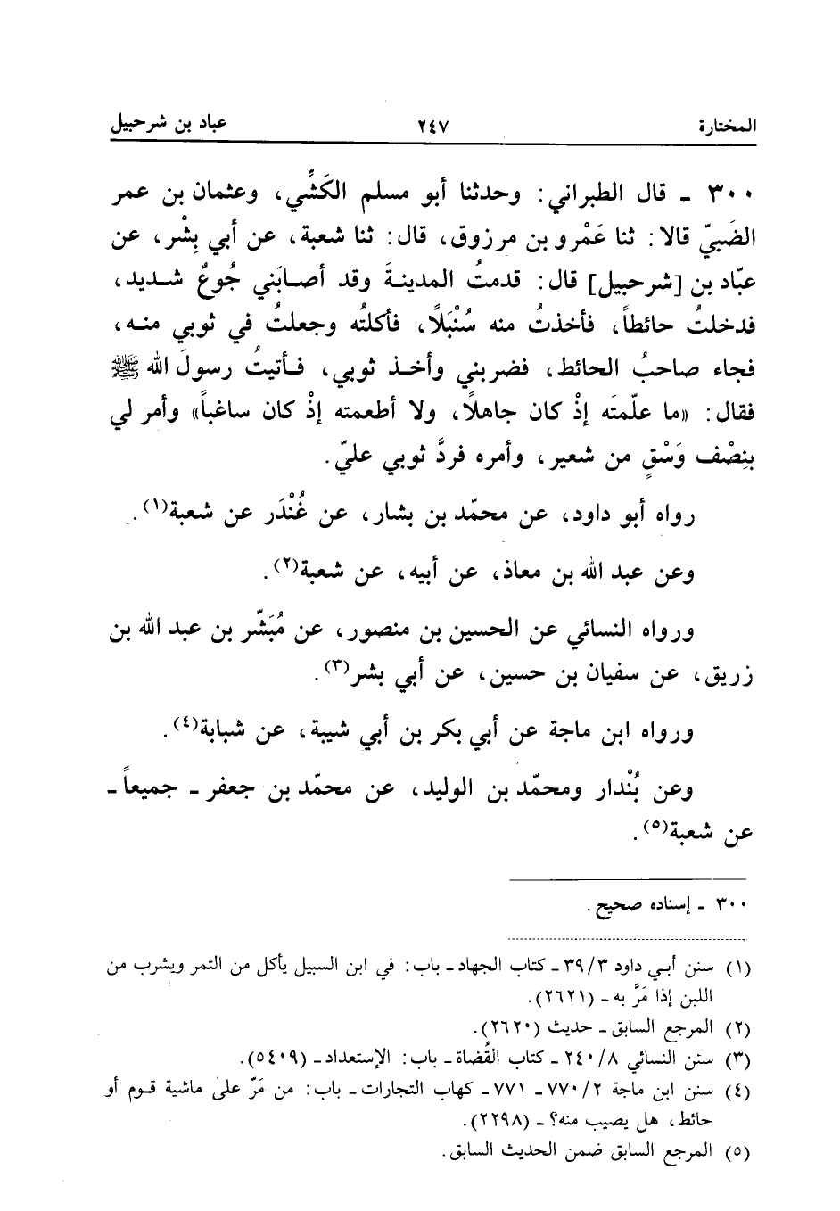 ٣٠٠ - قَالَ الطَّبَرَانِيُّ: وَحَدَّثَنَا أَبُو مُسْلِمٍ الْكَشِّيُّ وَعُثْمَانُ بْنُ عُمَرَ الضَّبِّيُّ قَالَا: ثَنَا عَمْرُو بْنُ مَرْزُوقٍ، قَالَ: ثَنَا شُعْبَةُ، عَنْ أَبِي بِشْرٍ، عَنْ عَبَّادِ بْنِ [شُرَحْبِيلَ] قَالَ: «قَدِمْتُ الْمَدِينَةَ وَقَدْ أَصَابَنِي جُوعٌ شَدِيدٌ فَدَخَلْتُ حَائِطًا فَأَخَذْتُ مِنْهُ سُنْبُلًا فَأَكَلْتُهُ وَجَعَلْتُ فِي ثَوْبِي مِنْهُ، فَجَاءَ صَاحِبُ الْحَائِطِ فَضَرَبَنِي وَأَخَذَ ثَوْبِي، فَأَتَيْتُ رَسُولَ اللهِ - صَلَّى اللهُ عَلَيْهِ وَسَلَّمَ - فَقَالَ: (مَا عَلَّمْتَهُ إِذْ كَانَ جَاهِلًا، وَلَا أَطْعَمْتَهُ إِذْ كَانَ سَاغِبًا) وَأَمَرَ لِي بِنِصْفِ وَسْقٍ مِنْ شَعِيرٍ، وَأَمَرَهُ فَرَدَّ ثَوْبِي عَلَيَّ».