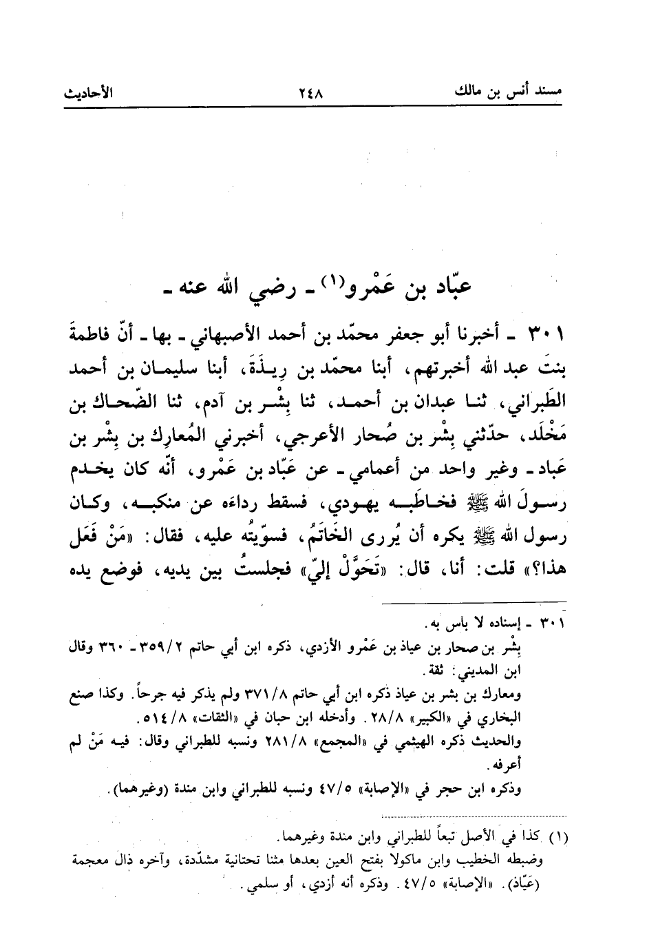 ٣٠١ - أَخْبَرَنَا أَبُو جَعْفَرٍ مُحَمَّدُ بْنُ أَحْمَدَ الْأَصْبَهَانِيُّ - بِهَا - أَنَّ فَاطِمَةَ بِنْتَ عَبْدِ اللهِ أَخْبَرَتْهُمْ، أَبْنَا مُحَمَّدُ بْنُ رِيذَةَ، أَبْنَا سُلَيْمَانُ بْنُ أَحْمَدَ الطَّبَرَانِيُّ، ثَنَا عَبْدَانُ بْنُ أَحْمَدَ، ثَنَا بِشْرُ بْنُ آدَمَ، ثَنَا الضَّحَّاكُ بْنُ مَخْلَدٍ، حَدَّثَنِي بِشْرُ بْنُ صُحَارٍ الْأَعْرَجِيُّ، أَخْبَرَنِي الْمُعَارِكُ بْنُ بِشْرِ بْنِ عَبَّادٍ - وَغَيْرُ وَاحِدٍ مِنْ أَعْمَامِي - عَنْ عَبَّادِ بْنِ عَمْرٍو: «أَنَّهُ كَانَ يَخْدُمُ رَسُولَ اللهِ - صَلَّى اللهُ عَلَيْهِ وَسَلَّمَ - فَخَاطَبَهُ يَهُودِيٌّ فَسَقَطَ رِدَاؤُهُ عَنْ مَنْكِبِهِ، وَكَانَ رَسُولُ اللهِ - صَلَّى اللهُ عَلَيْهِ وَسَلَّمَ - يَكْرَهُ أَنْ يُرَى الْخَاتَمُ، فَسَوَّيْتُهُ عَلَيْهِ، فَقَالَ: (مَنْ فَعَلَ هَذَا؟ ) قُلْتُ: أَنَا، قَالَ: (تَحَوَّلْ إِلَيَّ). فَجَلَسْتُ بَيْنَ يَدَيْهِ، فَوَضَعَ يَدَهُ