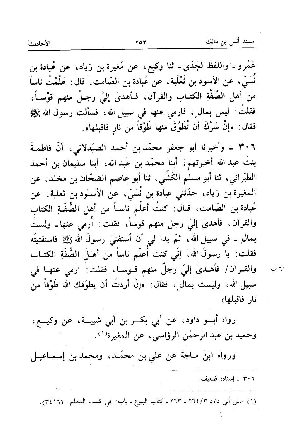 ٣٠٦ - وَأَخْبَرَنَا أَبُو جَعْفَرٍ مُحَمَّدُ بْنُ أَحْمَدَ الصَّيْدَلَانِيُّ أَنَّ فَاطِمَةَ بِنْتَ عَبْدِ اللهِ أَخْبَرَتْهُمْ، أَبْنَا مُحَمَّدُ بْنُ عَبْدِ اللهِ، أَبْنَا سُلَيْمَانُ بْنُ أَحْمَدَ الطَّبَرَانِيُّ، ثَنَا أَبُو مُسْلِمٍ الْكَشِّيُّ، ثَنَا أَبُو عَاصِمٍ الضَّحَّاكُ بْنُ مَخْلَدٍ، عَنِ الْمُغِيرَةِ بْنِ زِيَادٍ، حَدَّثَنِي عُبَادَةُ بْنُ نُسَيٍّ، عَنِ الْأَسْوَدِ بْنِ ثَعْلَبَةَ، عَنْ عُبَادَةَ بْنِ الصَّامِتِ قَالَ: «كُنْتُ أُعَلِّمُ نَاسًا مِنْ أَهْلِ الصُّفَّةِ الْكِتَابَ وَالْقُرْآنَ، فَأَهْدَى إِلَيَّ رَجُلٌ مِنْهُمْ قَوْسًا فَقُلْتُ: أَرْمِي عَنْهَا - وَلَيْسَتْ بِمَالٍ - فِي سَبِيلِ اللهِ، ثُمَّ بَدَا لِي أَنْ أَسْتَفْتِيَ رَسُولَ اللهِ - صَلَّى اللهُ عَلَيْهِ وَسَلَّمَ - فَاسْتَفْتَيْتُهُ فَقُلْتُ: يَا رَسُولَ اللهِ إِنِّي كُنْتُ أُعَلِّمُ نَاسًا مِنْ أَهْلِ الصُّفَّةِ الْكِتَابَ وَالْقُرْآنَ فَأَهْدَى إِلَيَّ رَجُلٌ مِنْهُمْ قَوْسًا، فَقُلْتُ: أَرْمِي عَنْهَا فِي سَبِيلِ اللهِ، وَلَيْسَتْ بِمَالٍ، فَقَالَ: (إِنْ أَرَدْتَ أَنْ يُطَوِّقَكَ اللهُ طَوْقًا مِنْ نَارٍ فَاقْبَلْهَا).»