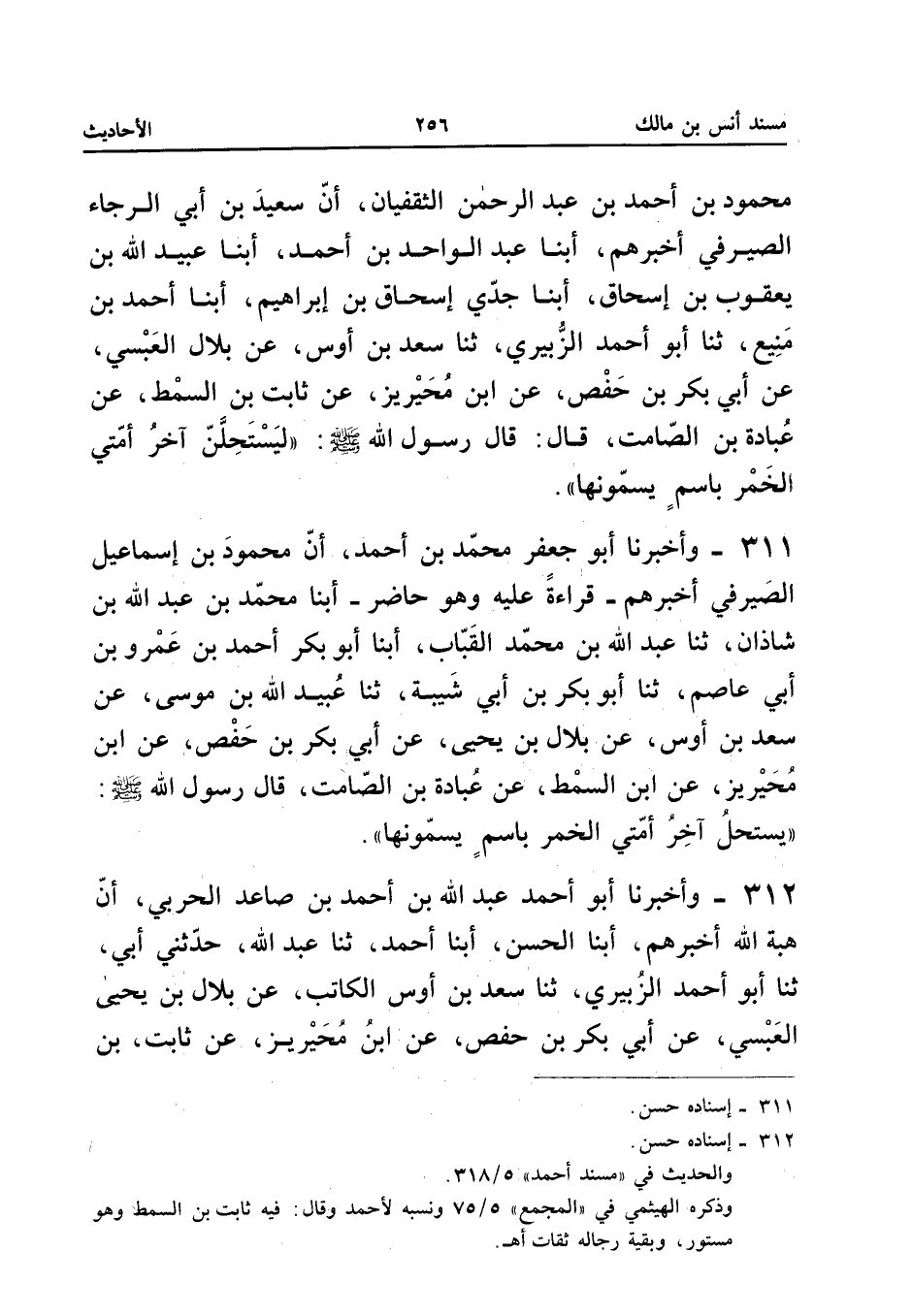٣١٢ - وَأَخْبَرَنَا أَبُو أَحْمَدَ عَبْدُ اللهِ بْنُ أَحْمَدَ بْنِ صَاعِدٍ الْحَرْبِيُّ، أَنَّ هِبَةَ اللهِ أَخْبَرَهُمْ، أَبْنَا الْحَسَنُ، أَبْنَا أَحْمَدُ، ثَنَا عَبْدُ اللهِ، حَدَّثَنِي أَبِي، ثَنَا أَبُو أَحْمَدَ الزُّبَيْرِيُّ، ثَنَا سَعْدُ بْنُ أَوْسٍ الْكَاتِبُ، عَنْ بِلَالِ بْنِ يَحْيَى الْعَبْسِيِّ، عَنْ أَبِي بَكْرِ بْنِ حَفْصٍ، عَنِ ابْنِ مُحَيْرِيزٍ، عَنْ ثَابِتِ بْنِ