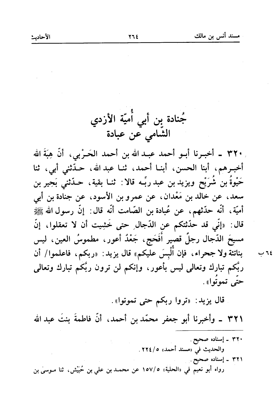 ٣٢٠ - أَخْبَرَنَا أَبُو أَحْمَدَ عَبْدُ اللهِ بْنُ أَحْمَدَ الْحَرْبِيُّ (¬١)، أَنَّ هِبَةَ اللهِ أَخْبَرَهُمْ، أَبْنَا الْحَسَنُ، أَبْنَا أَحْمَدُ، ثَنَا عَبْدُ اللهِ، حَدَّثَنِي أَبِي، ثَنَا حَيْوَةُ بْنُ شُرَيْحٍ وَيَزِيدُ بْنُ عَبْدِ رَبِّهِ قَالَا: ثَنَا بَقِيَّةُ، حَدَّثَنِي بَحِيرُ بْنُ سَعْدٍ، عَنْ خَالِدِ بْنِ مَعْدَانَ، عَنْ عَمْرِو بْنِ الْأَسْوَدِ، عَنْ جُنَادَةَ بْنِ أَبِي أُمَيَّةَ أَنَّهُ حَدَّثَهُمْ، عَنْ عُبَادَةَ بْنِ الصَّامِتِ أَنَّهُ قَالَ: إِنَّ رَسُولَ اللهِ - صَلَّى اللهُ عَلَيْهِ وَسَلَّمَ - قَالَ: («إِنِّي قَدْ حَدَّثْتُكُمْ عَنِ الدَّجَّالِ حَتَّى خَشِيتُ أَنْ لَا تَعْقِلُوا، إِنَّ مَسِيحَ الدَّجَّالِ رَجُلٌ قَصِيرٌ أَفْحَجُ، جَعْدٌ أَعْوَرُ مَطْمُوسُ الْعَيْنِ لَيْسَ بِنَاتِئَةٍ وَلَا جَحْرَاءَ، فَإِنْ أُلْبِسَ عَلَيْكُمْ) قَالَ يَزِيدُ: (رَبُّكُمْ، فَاعْلَمُوا أَنَّ رَبَّكُمْ تَبَارَكَ وَتَعَالَى لَيْسَ بِأَعْوَرَ، وَإِنَّكُمْ لَنْ تَرَوْا رَبَّكُمْ تَبَارَكَ وَتَعَالَى حَتَّى تَمُوتُوا»).