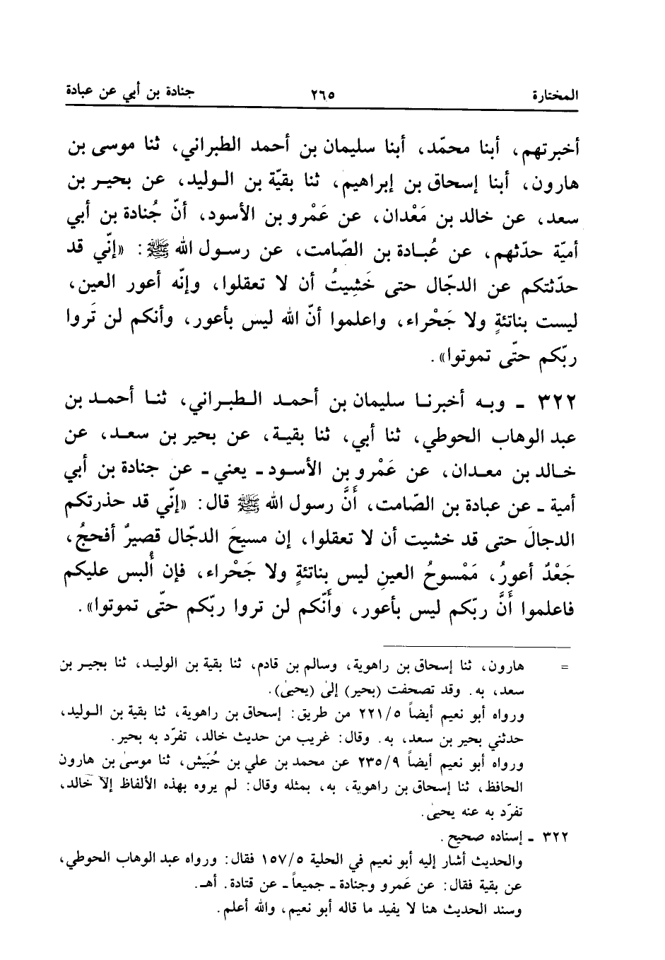٣٢٢ - وَبِهِ أَخْبَرَنَا سُلَيْمَانُ بْنُ أَحْمَدَ الطَّبَرَانِيُّ، ثَنَا أَحْمَدُ بْنُ عَبْدِ الْوَهَّابِ الْحَوْطِيُّ، ثَنَا أَبِي، ثَنَا بَقِيَّةُ، عَنْ بَحِيرِ بْنِ سَعْدٍ، عَنْ خَالِدِ بْنِ مَعْدَانَ، عَنْ عَمْرِو بْنِ الْأَسْوَدِ - يَعْنِي: عَنْ جُنَادَةَ بْنِ أَبِي أُمَيَّةَ - عَنْ عُبَادَةَ بْنِ الصَّامِتِ: أَنَّ رَسُولَ اللهِ - صَلَّى اللهُ عَلَيْهِ وَسَلَّمَ - قَالَ: («إِنِّي قَدْ حَذَّرْتُكُمُ الدَّجَّالَ حَتَّى قَدْ خَشِيتُ أَنْ لَا تَعْقِلُوا، إِنَّ مَسِيحَ الدَّجَّالِ قَصِيرٌ أَفْحَجُ، جَعْدٌ أَعْوَرُ، مَمْسُوحُ الْعَيْنِ لَيْسَ بِنَاتِئَةٍ وَلَا جَحْرَاءَ، فَإِنْ أُلْبِسَ عَلَيْكُمْ فَاعْلَمُوا أَنَّ رَبَّكُمْ لَيْسَ بِأَعْوَرَ، وَأَنَّكُمْ لَنْ تَرَوْا رَبَّكُمْ حَتَّى تَمُوتُوا»).