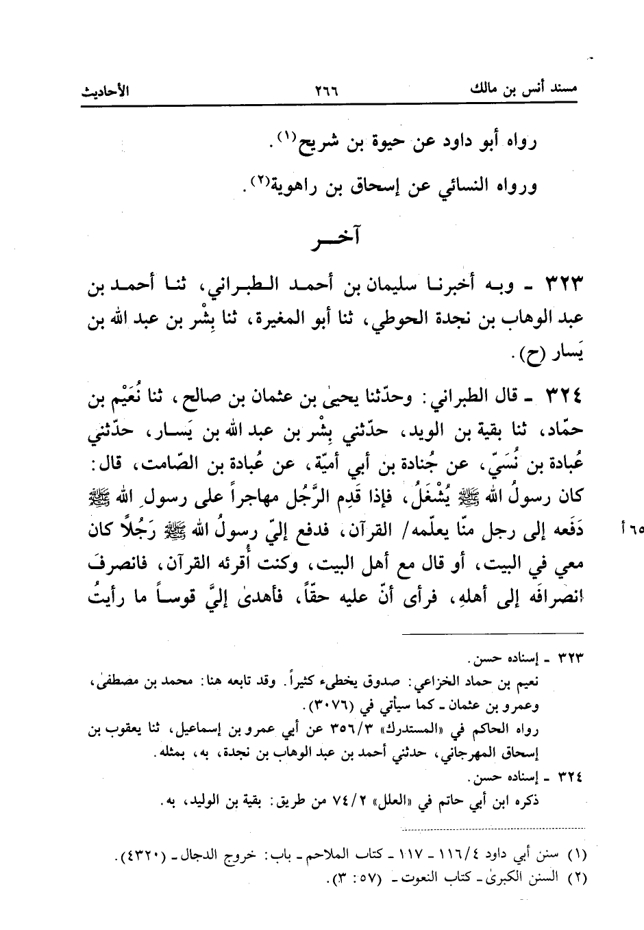٣٢٤ - قَالَ الطَّبَرَانِيُّ: وَحَدَّثَنَا يَحْيَى بْنُ عُثْمَانَ بْنِ صَالِحٍ، ثَنَا نُعَيْمُ بْنُ حَمَّادٍ، ثَنَا بَقِيَّةُ بْنُ الْوَلِيدِ، حَدَّثَنِي بِشْرُ بْنُ عَبْدِ اللهِ بْنِ يَسَارٍ، حَدَّثَنِي عُبَادَةُ بْنُ نُسَيٍّ، عَنْ جُنَادَةَ بْنِ أَبِي أُمَيَّةَ، عَنْ عُبَادَةَ بْنِ الصَّامِتِ قَالَ: «كَانَ رَسُولُ اللهِ - صَلَّى اللهُ عَلَيْهِ وَسَلَّمَ - يُشْغَلُ، فَإِذَا قَدِمَ الرَّجُلُ مُهَاجِرًا عَلَى رَسُولِ اللهِ - صَلَّى اللهُ عَلَيْهِ وَسَلَّمَ - دَفَعَهُ إِلَى رَجُلٍ مِنَّا يُعَلِّمُهُ الْقُرْآنَ، فَدَفَعَ إِلَيَّ رَسُولُ اللهِ - صَلَّى اللهُ عَلَيْهِ وَسَلَّمَ - رَجُلًا كَانَ مَعِي فِي الْبَيْتِ، أَوْ قَالَ: مَعَ أَهْلِ الْبَيْتِ، وَكُنْتُ أُقْرِئُهُ الْقُرْآنَ، فَانْصَرَفَ انْصِرَافَهُ إِلَى أَهْلِهِ، فَرَأَى أَنَّ عَلَيْهِ حَقًّا، فَأَهْدَى إِلَيَّ قَوْسًا مَا رَأَيْتُ
